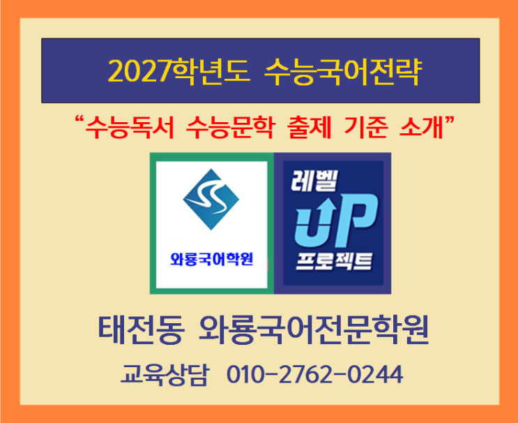 【수능국어 출제 기준은 정해져 있다】 태전동 국어학원 와룡국어전문학원에서 2027학년도 수능국어 출제 기준을 소개합니다. 소설문학에서는 낯선 작품 위주로 출제를 하는 경향이 뚜렷하기 때문에, 인물 간의 관계와 사건(갈등)의 선,후 관계를 파악하는 학습법이 국어 1등급을 만들 수 있는 핵심요소입니다. 그러므로, 우선 EBS교재에 수록된 작품들을 빠짐없이 정리하고 학습하는 것이 필요합니다. 독서영역은 주어진 제시문이 대부분 장문이면서 이해력과 사고력을 요구하는 내용으로 출제합니다. 독서융합지문은 출제에서 배제되는 경향이지만 장문의 지문에서 파악해야 하는 정보의 양을 일목요연하게 정리하는 능력이 매우 중요합니다. 【....... <img src="https://blogthumb.pstatic.net/MjAyNjAzMTRfNDkg/MDAxNzczNDU1OTE2NDU3.0xkymOyNgUYEmSYecb0OXmpa-AcQb4J0hL1CTbmFmD0g.dnkTLcbru6-mvEiwwDP7_qmiciKaeaKlHx318vXhQA0g.PNG/%BF%CD%B7%E6%C7%EC%B5%E5.png?type=s3" />