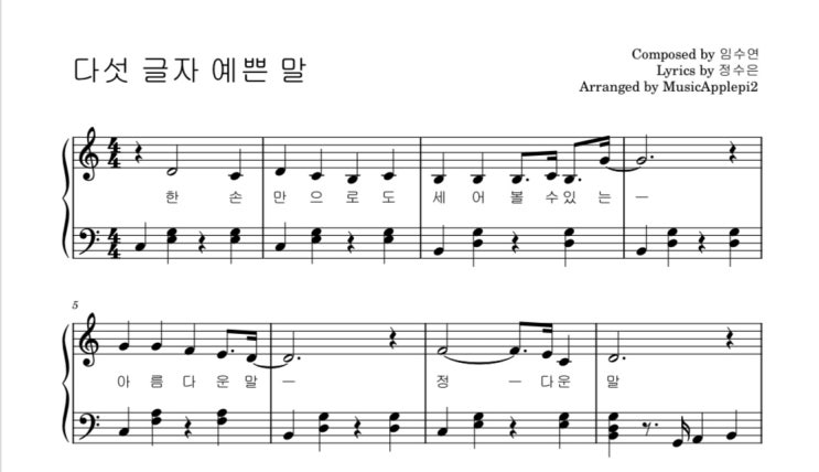 안녕하세요. 하늘소리음악학원 하늘소리선생님입니다. 새학기가 시작된지 벌써 한 달이 되어갑니다. 이제 우리 아이들은 학교 생활에 어느정도 적응이 된 느낌이네요^^ 오늘 소개하는 곡은 아이들에게 꾸준히 사랑받는 동요 ‘다섯 글자 예쁜 말’ 피아노 반주 악보입니다. 초등학생도 연주할 수 있는 쉬운 반주 악보로 편곡했습니다. ⸻ 쉬운 피아노 반주 악보 ✔ 단순한 반주 패턴 ✔ 부담 없는 코드 진행 ✔ 자연스럽게 이어지는 멜로디 동요를 처음 반주하는 학생들도 편하게 연주할 수 있도록 구성했습니다. ⸻ 이런 곳에 활용해 보세요 ✔ 학교 음악시간 ✔ 학급 발표 / 학예회 ✔ 연주 영상 특히 새학기에는 아이들이 서로에게 따뜻한 말....... <img src="https://blogthumb.pstatic.net/MjAyNjAzMjZfMTEz/MDAxNzc0NDk4MDA3MDk0.XfehTCHnqDad4vxhk4zDHrSKUTtbhoQOVzXXKvN1RZgg.qglOsjJRfBdXLrPApG4HOPzeN_wioxgKEHAvZlmW4Hwg.JPEG/KakaoTalk_20260326_130603624.jpg?type=s3" />