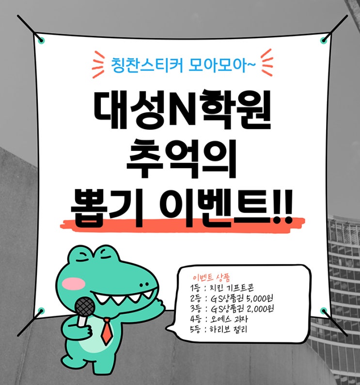 칭찬 스티커로 만드는 즐거운 공부 습관 안녕하세요. 옥정 대성N학원입니다. 공부는 단순히 성적을 올리는 과정이 아니라 아이들이 스스로 노력하고 성취감을 느끼는 경험이 중요합니다. 그래서 저희 학원에서는 초등부 친구들을 대상으로 ‘추억의 뽑기 이벤트’를 진행했습니다 이번 이벤트는 아이들이 열심히 공부한 만큼 즐거운 보상을 받을 수 있도록 준비했습니다. ✔ 칭찬 스티커 지급 기준 주간 테스트에서 100점을 받은 친구들 영단어 시험에서 100점을 받은 친구들에게 칭찬 스티커를 지급했습니다. 아이들은 스티커를 받기 위해 시험 준비도 더 꼼꼼히 하고 스스로 공부하려는 모습을 보여주었습니다. 작은 동기부여가 공부 습관....... <img src="https://blogthumb.pstatic.net/MjAyNjAyMDRfMTgg/MDAxNzcwMTk0MDg1NzA4.7vTMKyqGxyx-OiugH03xTk7_dVDZbT3iBBwymWN_hbMg.Gac-94ImYN3RTc-_mWuRlEIR8BJMoj0Bj5apjfH5l8Ug.JPEG/%BB%CC%B1%E2%C0%CC%BA%A5%C6%AE.jpg?type=s3" />