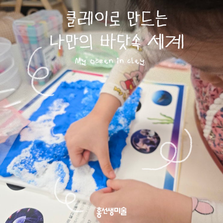 미술 수업에 금방 흥미를 읽는 우리 아이, 어떤 수업이 좋을까요? 아이들은 새로운 재료와 기법을 만날 때 가장 집중합니다. 특히 만지고, 빚고, 붙이는 촉각적 경험은 아이들의 호기심을 자극하죠. 오늘 소개할 수업은 클레이로 바닷속 풍경을 만들고 투명 필름으로 물속 효과까지 표현해보는 작업입니다. 단계마다 새로운 재료를 만나며 아이들의 눈이 반짝이는 수업이에요. 클레이로 만드는 나만의 바닷속 세계 ️ 준비물 칼라클레이 OHP 필름 사인펜 부조 기법을 활용해 바닷속 공간과 다양한 바다 생물을 만들고 투명한 필름으로 물속 느낌을 연출합니다. Step 1. 바닷속 배경 만들기 다양한 이미지 자료를 관찰하며 선생님과....... <img src="https://blogthumb.pstatic.net/MjAyNjAyMDVfMjA5/MDAxNzcwMjMxMDA4NzM4.y-tmBRD8jXqx64R-kUwMFOCxA9-1zVG6is3gkCUrMwog.j7kSx9ljcTAV7icEx4i5xFJmJVJD2jDmd3bJGWu-NUgg.JPEG/%B4%EB%B9%AE3.jpg?type=s3" />
