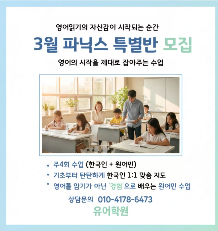 옥정 영어학원, 초등 영어 시작은 파닉스가 가장 중요합니다 옥정동 초등영어학원을 찾는 학부모님들과 상담을 하다 보면 가장 많이 듣는 질문이 있습니다. “영어를 처음 시작하는데 어디서부터 해야 할까요?” 영어를 처음 시작하는 시기에는 단어 암기나 문장 학습보다 영어 소리를 이해하는 과정 읽기의 기초를 만드는 과정 이 가장 중요합니다. 그래서 옥정 영어학원에서는 영어를 처음 시작하는 학생들을 위해 옥정 파닉스 특별반을 운영하고 있습니다. 초등 영어, 왜 파닉스부터 시작해야 할까요? 옥정동 초등영어학원을 다니는 학생들을 지도하다 보면 읽기를 어려워하는 아이들의 대부분은 파닉스 기초가 부족한 경우가....... <img src="https://blogthumb.pstatic.net/MjAyNjAyMDVfNiAg/MDAxNzcwMjgxMzAxNTk4.D5mbQ-ENLcbmlF--4Bl1cj7vYGGhtky_cUg9pbINLq4g.w9XUyLyoxDWFpjPqi1osJFoSmUoKlGBqkaWe_ut-apIg.JPEG/900%A3%DF1770270497267.jpg?type=s3" />
