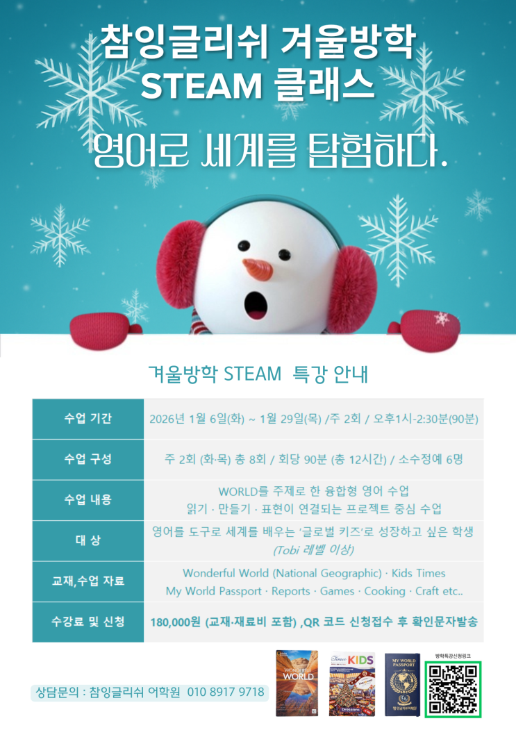 참잉글리쉬어학원의 STEAM 수업은 하나의 주제를 중심으로 여러 차시에 걸쳐 깊이 있게 탐구하는 특강 프로그램입니다. 매 차시마다 정해진 활동 순서나 고정된 방식이 있는 수업이 아니라, 하나의 주제를 중심에 두고 다양한 자료와 활동을 활용해 아이들이 주제를 입체적으로 이해할 수 있도록 설계되어 있습니다. 주제는 유지되지만 접근 방식은 열려 있고, 수업의 흐름은 아이들의 반응과 탐구 방향에 따라 유연하게 확장되는 구조로 진행됩니다. ✈️ 여권을 활용한 탐험형 학습 구조 STEAM 특강에서는 아이들이 개인별 여권 형태의 학습 자료를 활용해 수업에 참여합니다. 이 여권은 단순한 소품이 아니라, 주제별 학습 내....... <img src="https://blogthumb.pstatic.net/MjAyNjAxMTRfMTIy/MDAxNzY4MzY3Nzg4OTQ2.zZ_7Zmz7NgEyGCWj8N2PWPfS2ur7wNnyqPyZJfFT13Ag.L1bDRBbqq0Kj_WJElCI4fNMCFpyz80egbC31MJQbM48g.PNG/KakaoTalk_20251226_113844544.png?type=s3" />