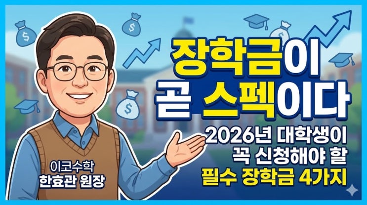 안녕하세요! 이코수학 한효관 원장입니다. 요즘 대학 등록금에 생활비까지, 학부모님들의 어깨가 참 무거우시죠? 보통 장학금이라고 하면 '소득 수준'이 낮아야만 받을 수 있다고 생각하시는 분들이 많아요. 하지만 2026년 장학금 트렌드는 조금 달라졌답니다. 오늘은 부모님의 소득과 상관없이, 우리 아이의 '역량'과 '성적'만으로 받을 수 있는 2026년 알짜배기 교외장학금 정보를 정리해 드릴게요. 단순한 학비 지원을 넘어, 취업 '스펙'까지 되는 꿀팁이니 끝까지 집중해 주세요! 1. 장학금이 곧 '스펙'이 되는 시대 (배경 설명) 예전에는 장학금이 가정 형편이 어려운 학생들을 돕는 &#x....... <img src="https://blogthumb.pstatic.net/MjAyNjAxMTlfNTgg/MDAxNzY4ODIzNjA5MDk1.GKS80MXOBtoA8zG8ng-OTF2Zve7sDXmaNquH5x9vmosg.2wJE9eJd-CU3LQv5a8QRTOaf-UrEcum3rVT7V7aU8Mwg.JPEG/unnamed_%284%29.jpg?type=s3" />