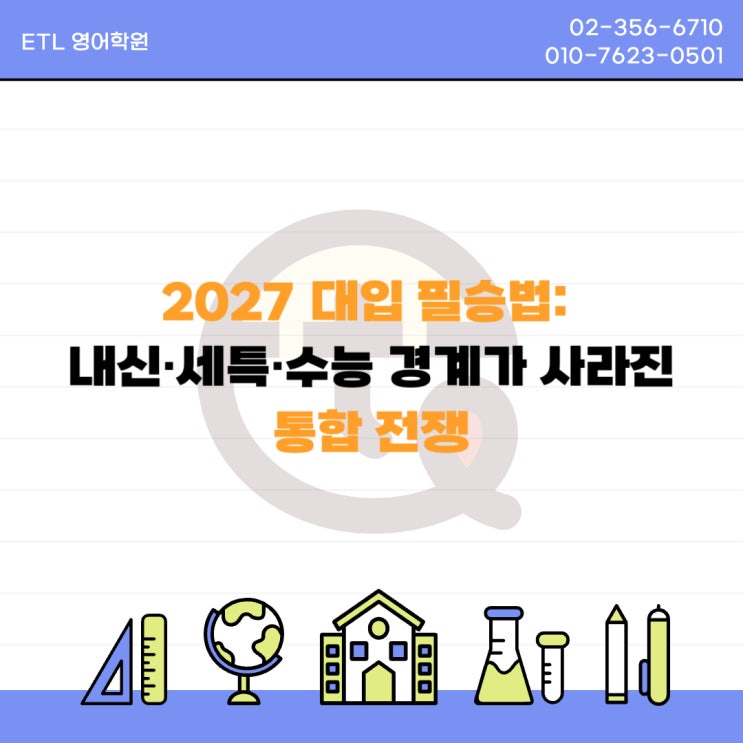안녕하세요! ETL 영어학원입니다 20027 대입 핵심: 하나만 잘해서는 못 간다 과거에는 교과전형은 내신 숫자, 정시는 수능 점수라는 공식이 성립했습니다. 하지만 2027학년도는 모든 전형이 서로의 영역을 침범하며 '병행 준비'를 강요하는 구조입니다. 1. 학생부교과전형의 진화: "서류평가가 당락을 가른다" 이제 내신 1.0 등급도 불합격할 수 있습니다. 주요 대학들이 교과전형에 '정성평가'를 대거 도입했기 때문입니다. 서류평가 도입 대학: 건국대, 경희대, 고려대, 성균관대, 한양대 등 10여 개교 반영 비율: 10~30% (이 차이가 수능 점수 수 점을 뒤집습니다.) 통합 전략: 교과전형을 쓰더라도 학종....... <img src="https://blogthumb.pstatic.net/MjAyNjAyMTJfMTc3/MDAxNzcwODk5ODQ5ODY2.CBWdnn4UqGZi2oQBO_rz96a5AZBTUDZiGhP8PxG_Kbgg.1CyQd8JlUrZNe7Ei9LYheEe3oNWNbE9xy8S6GtfgVMsg.JPEG/%BA%ED%B7%CE%B1%D7_%B4%EB%C7%A5%C0%CC%B9%CC%C1%F6-001_%282%29.jpg?type=s3" />