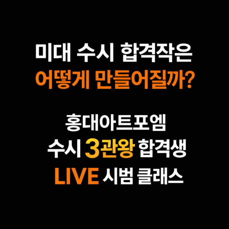 미대수시 합격작은 어떻게 만들어질까? 미대 입시를 준비하는 학생들과 학부모님들이 가장 많이 하는 질문이 있습니다. “도대체 어떤 그림이 합격하는 걸까요?” 열심히 그리는 학생들은 많지만 정작 합격하는 그림이 무엇인지 실제로 보는 기회는 많지 않습니다. 그래서 홍대아트포엠에서는 2026 수시 다관왕 합격생들이 직접 보여주는 LIVE 시범 클래스를 준비했습니다. 이번 클래스에서는 실제 합격생들이 시험처럼 그림을 풀어가는 과정을 처음부터 끝까지 실시간으로 확인할 수 있습니다. 단순한 결과가 아니라 어떻게 생각하고, 어떻게 문제를 풀고, 어떻게 화면을 구성하는지 그 과정 자체를 볼 수 있는 자리입니다. 합격생들이 직접 보....... <img src="https://blogthumb.pstatic.net/MjAyNjAzMTVfMSAg/MDAxNzczNTM5Njc4Nzgw.W9QoB3a-yAvwMIApL7iTPswob2jyt3xMDvBZi5K02TMg.u5I4S_Ygp-BVMLNajXunnP5JQj6Ek_t6EG-u9RHoTtgg.PNG/900%A3%DFChatGPT_Image_2026%B3%E2_3%BF%F9_15%C0%CF_%BF%C0%C0%FC_10%A3%DF45%A3%DF56.png?type=s3" />