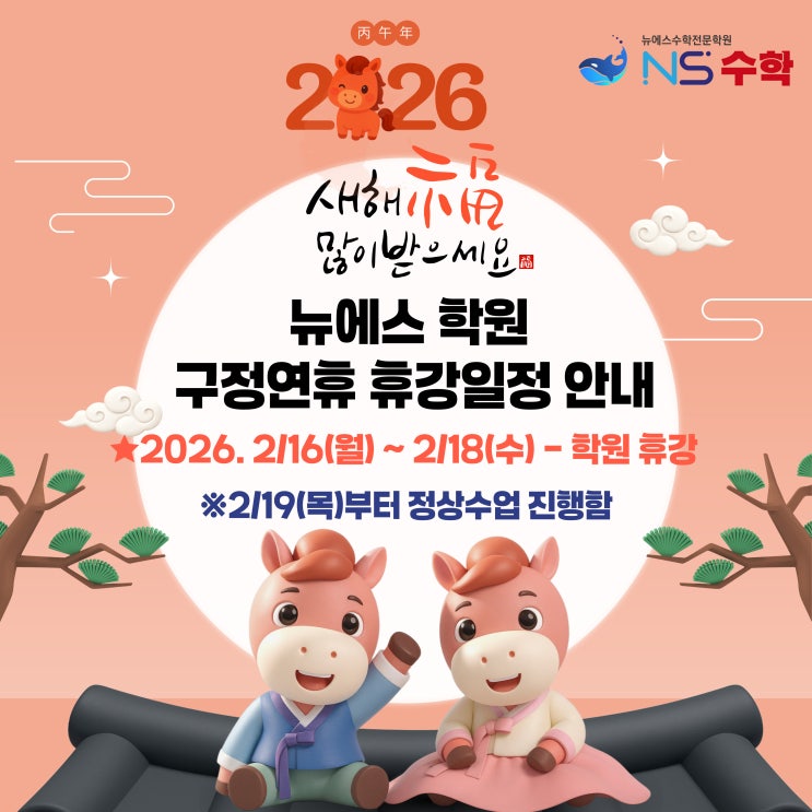 안녕하세요 뉴에스학원입니다^^ 학원 휴강에 대하여 안내드립니다! ●구정 연휴 안내 2/16(월) ~ 2/18(수)휴강 -> 2/19(목)부터 정상 수업 학원 이용과 방문 상담 등의 일정에 착오 없으시도록 확인 부탁드리겠습니다 ! 새해 복 많이 받으시고 건강하시길 바랍니다~~^^ 감사합니다~^^ <img src="https://blogthumb.pstatic.net/MjAyNjAyMDlfMTY4/MDAxNzcwNjI0NjYyMzUw.-ckPrIhCEmtWwoHqfZzuKvExLmrFMA8NBCnor8SRP94g.0onh54VKwsRhMkHGKSiJfFZhRWg-sM8JJOj22twGj54g.JPEG/26%B3%E2_%B1%B8%C1%A4%C8%DE%B0%AD_%BE%C8%B3%BB.jpg?type=s3" />