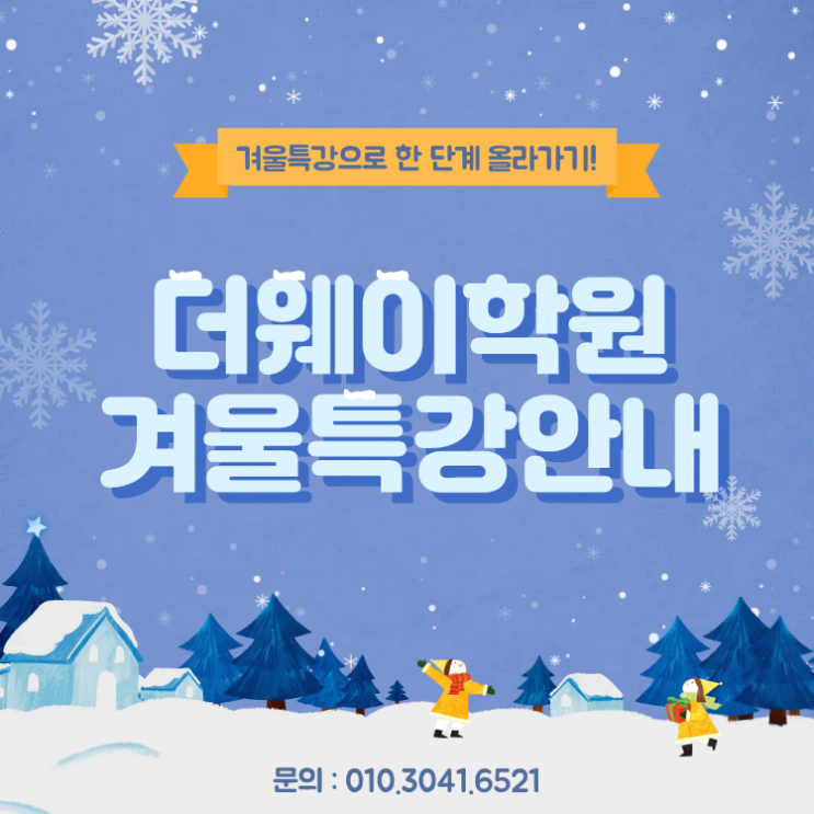 안녕하세요 더웨이학원입니다. 어느덧 찬 바람이 부는 겨울❄️이 되었습니다. 겨울방학은 잘하는 학생은 더 단단해지고, 부족한 학생은 흐름을 바로잡는 시간입니다. 더웨이학원 겨울방학 특강은 모든 학생을 동일한 진도로 묶지 않고, 각자의 현재 위치에 맞춰 진행합니다! !! 정규시간표는 학기중과 동일하게 진행되며, 특강은 오전,이른 오후에 진행되는 특강입니다. 신청 및 수업 기간 신청 기간: 12월 15일 ~ 12월 26일 수업 기간: 01월 12일(월) ~ 02월 25일(수) (총 6주 / 설날 휴강) 신청방법은 하단의 구글폼 이용 수학 방학특강안내 ⭐수업 내용 학생별 수준에 맞춘 맞춤 진도 수업 현재 학습 흐름을 유지하며 방학 동안 끊김 없이 학....... <img src="https://blogthumb.pstatic.net/MjAyNTEyMTNfMjU0/MDAxNzY1NTUzNjczOTQ3.a3j4Eu8u2Ms2K0bBTM3KM1XLgCSbyYuTwHDzS9pyrOAg.fQYPdQP9Kgr2zTxj2O_7qFq_mrrdYkGOT3UJCJZZUgkg.PNG/%C1%A6%B8%F1%C0%BB_%C0%D4%B7%C2%C7%D8%C1%D6%BC%BC%BF%E4._%281%29.png?type=s3" />