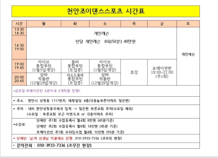 천안조이댄스스포츠학원시간표 *모든 수업은 기본을 중점으로 체중이동을 완벽하게 수업을진행합니다 매력적이고 열정넘치는운동 활동적인 댄스스포츠를 느껴보시기바랍니다 *부담없이 문의해주시면 친절하게 답변해드립니다 ☎️010 3933 7336 <img src="https://blogthumb.pstatic.net/MjAyNTEyMTNfOTQg/MDAxNzY1NjI3Mzk5MjAw.y2SDuP0E9RUlmVS5LKNyWEGs5gI8G2es6C3drf3FS3kg.TPn241JD0kvvMHBNL__fVzDwFfC6f6vM-K2p3jDJMUsg.JPEG/900%A3%DFScreenshot%A3%DF20251213%A3%DF151903%A3%DFHancom_Office_Viewer.jpg?type=s3" />