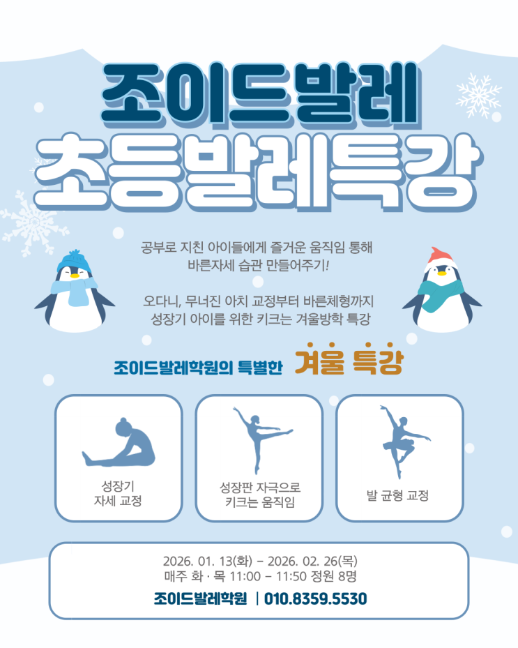 안녕하세요 조이드발레입니다 긴 겨울방학은 아이들의 생활 리듬이 무너지기 쉬운 시기이지만, 반대로 성장과 자세를 바로잡을 수 있는 가장 좋은 기회이기도 하죠! 특히 초등학생 시기에는 키 성장뿐만 아니라 자세 습관, 발 균형, 체형이 빠르게 굳어지기 때문에 이 시기의 관리가 무엇보다 중요해요!!⭐⭐⭐⭐⭐ 천안에서 초등 발레, 성장기 발레, 자세교정 발레를 고민하고 계신다면 이번 겨울방학, 천안발레학원 조이드발레의 겨울방학 특강을 추천드립니다!! 요즘 아이들, 책상에 앉아 있는 시간이 너무 길지않나요! 고개를 숙이고, 다리를 꼬고, 등을 굽힌 자세가 반복되다 보면 거북목 굽은 어깨 오다리 무너진 발 아치 중심 불균형....... <img src="https://blogthumb.pstatic.net/MjAyNTEyMTRfMTgy/MDAxNzY1NzE1OTg3MTEz._-ZCiVshXk4ybiKd0cZ4lvShFw_QLc-zFMbR_8FBPK0g.oAfw3gZ0FgWzdUBNUskSlG0gXBuudEU3_9OqV5a9veMg.PNG/%C3%CA%B5%EE%B9%DF%B7%B9%C6%AF%B0%AD.png?type=s3" />