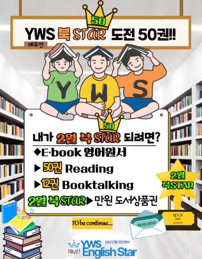 2월 이벤트 One!-- 북 STAR 2월 이벤트 Two!!-- 설 STAR 북 STAR & 설 STAR ▶2월 북 STAR!! 2월 한달동안~~~^^ 우리 YWS예우선 English Star학생들 E.book& Paper book 영어원서 50권 도전!!! 북talking(북 Speaking) 12권 도전!!! 할수있죠~! 할수있다~! 애들아~! YWS(예우선)에 1만원 도서상품권 받으러 가자~!!! ▶2월 설 STAR!! SUL날 가족,친지 앞에서 영어스피치, 원서 리딩, 영어노래(1분)등(댄스를 곁들이면 가산점) 영어로 자랑을 뽐내는 영상을 보내주세요! ★금상 세뱃돈 5만원 ★은상 세뱃돈 3만원 ★인기상 세뱃돈 1만 SINCE2003 실력이 검증된 24년 전통 명문영어 YWS예우선 English Star 마곡엠밸리 12단지 1201-206 htt....... <img src="https://blogthumb.pstatic.net/MjAyNjAyMTBfOTYg/MDAxNzcwNjU1NzcyNzY1.Cl2-93VVmZhMoym2J2I5T4szbuc45TltEZxPvWpXoDwg.RndFv2UHzV_VV_3Q3GndLmIwtJXA3rBf-pGnykw-xK0g.PNG/2%BF%F9_%BA%CF%BD%BA%C5%B8%C4%B8%C3%C4.png?type=s3" />
