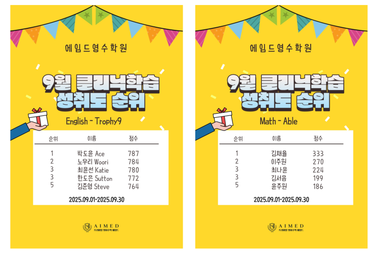 25년 09월 영어, 수학 클리닉학습 성취도 순위입니다.