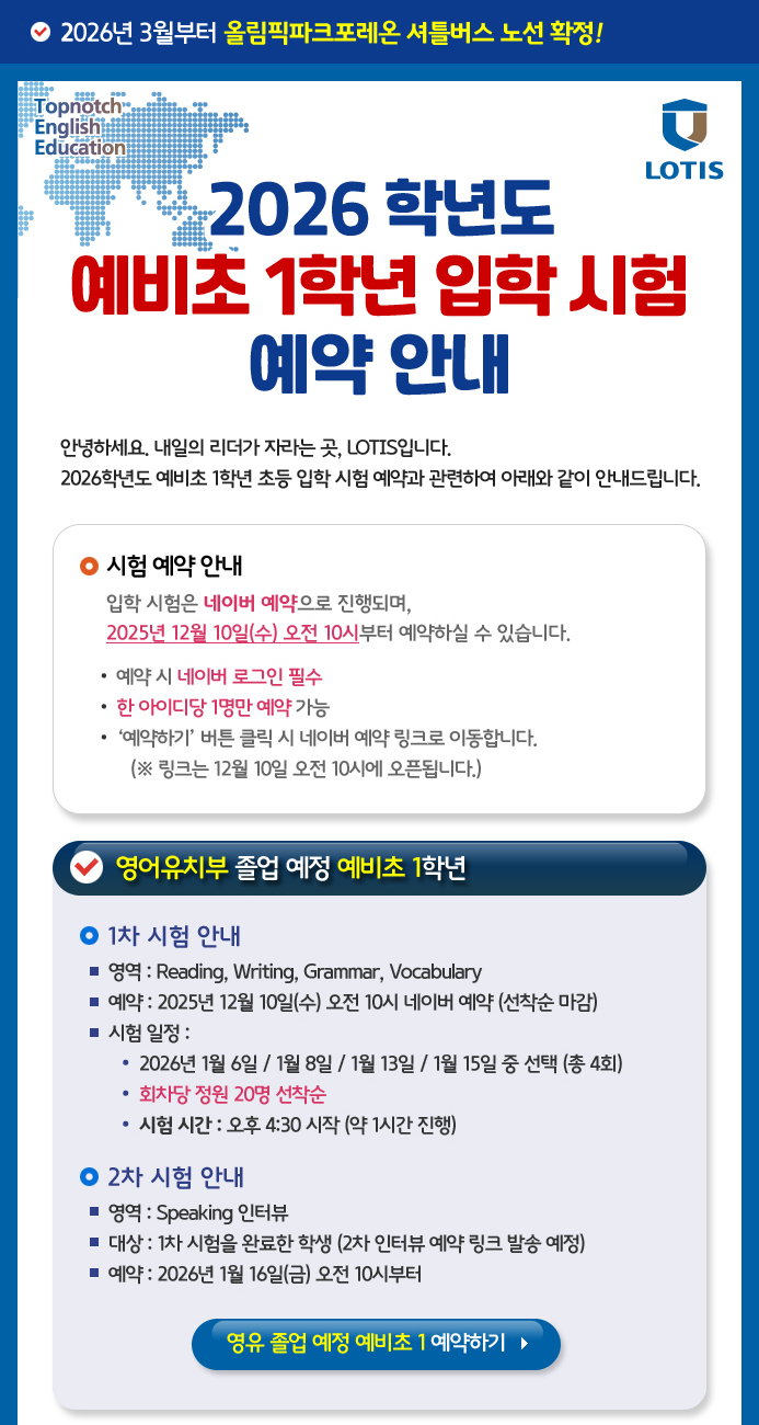 2026학년도 예비초 1학년 입학 시험 예약 안내