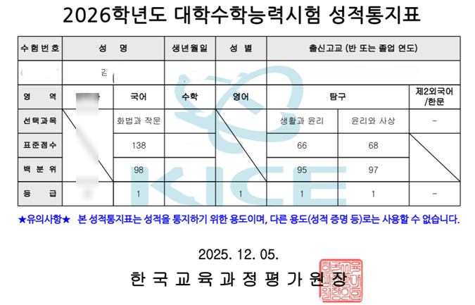 이번에도 다올이 다올! 했습니다^^!! 12월 5일, 2026 대학수학능력시험 성적표가 공개되었는데요. 만점자는 단 5명, 영어 1등급은 3.11%로 지난 수능이 만점자 11명, 영어 1등급 6.22%였던 것과 비교하면 상당히 어려웠던 시험임을 알 수 있었습니다. 국어 또한 역대급 불수능으로 평가받았던 재작년 국어 만점과의 표준점수 차이가 단 3점밖에 나지 않으면서, 국어, 영어가 특히 어려웠던 불수능임이 밝혀졌습니다. 하지만 이번 불수능에도 불구하고, 저희 다올 학생들이 '운'이 아닌 체계적인 학습으로 만들어낸 압도적인 결과를 보여드리겠습니다! 먼저 김OO학생입니다. 2025학년도 수능 국어6 영어3 탐구1 ↓ 2026학년도 수능 국어....... <img src="https://blogthumb.pstatic.net/MjAyNTEyMDVfMjM4/MDAxNzY0OTM1NjQ0MTkw.mEqchZsQAFoNKCzJwkYPy1OFBLOGLmUSR4FkDbtNMd4g.rJqTr8-nlHc45QVKC3dsbjmzQyn3Sl7Yy3ukTt_JviEg.PNG/%C8%AD%B8%E9_%C4%B8%C3%B3_2025-12-05_151743.png?type=s3" />