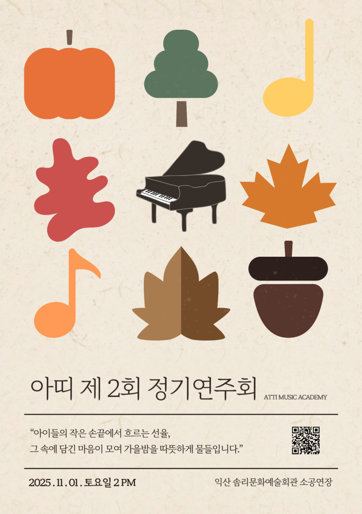 제2회 아띠 정기연주회 아이들의 음악이 무대 위에 꽃처럼 피어난 날 올해로 두 번째를 맞이한 아띠음악학원 정기연주회가 따뜻한 박수 속에서 아름답게 마무리되었습니다. 무대 위에서 설렘과 긴장을 안고 한 음 한 음 연주해 준 아이들, 그 모습을 지켜보며 응원해 주신 학부모님들 덕분에 더욱 뜻깊은 시간이 되었습니다. 다양한 프로그램 구성 피아노 솔로, 듀엣연주를 각자만의 색깔로 준비한 풍성한 무대는 학원에서 배운 음악 경험을 마음껏 펼칠 수 있는 시간이었습니다. 아이들의 성장과 노력의 순간 사진 속 환하게 웃는 아이들의 모습에는 한 해 동안 꾸준히 연습하며 쌓아온 노력, 끈기, 자신감이 그대로 담겨 있어요....... <img src="https://blogthumb.pstatic.net/MjAyNTExMjdfMTc0/MDAxNzY0MjIwMTY5NDk3.8aV3kYTMYWQwvD1KJhv5u27SnVWox0rN5Peds_Nb6fcg.Oz0YnIFRYceGY_AYJwBBcrYyIOLxNE7d_WikmrPba8sg.PNG/%BE%C6%B6%EC_%C1%A62%C8%B8_%C1%A4%B1%E2%BF%AC%C1%D6%C8%B8_.png?type=s3" />
