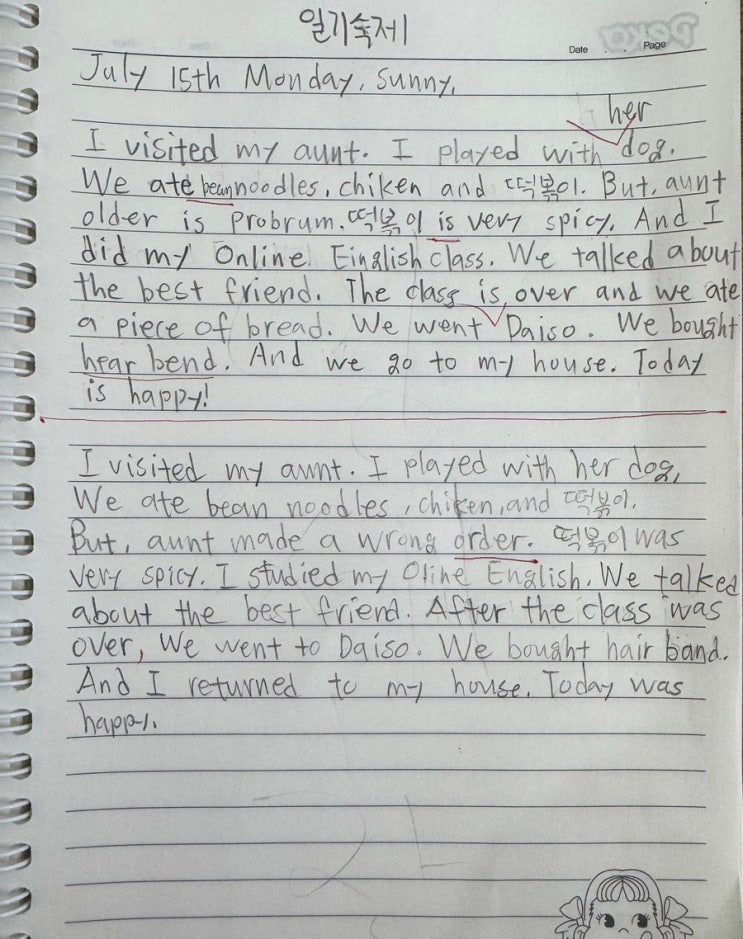 안녕하세요~ 온원장입니다^^ 오늘은 저희 초등 아이들의 영어 실력을 한단계 업그레이드해주고 있는 '영어일기' 쓰기를 소개해드리려 합니다~ 영어일기는 저희 온영어의 특별 커리큘럼 중 하나인데요 온영어에서 진행하는 영어일기 쓰기는 아이들이 그동안 말로 뱉어보고 써왔던 영어 표현들을 나만의 문장으로 만드는 시간이에요. 하지만.. 처음 아이들은 영어일기 쓰기를 많이 낯설어 합니다. 눈으로만 읽던 문장들을 직접 써보는게 얼마나 막막할까요? ㅎ 그래서 온영어에서는 이렇게 지도합니다. 1. 아이들의 수준과 생각에 맞춰 문장 구조, 표현 등을 '세심하게 교정'하고 틀린 문장을 '제대로 된 문장'으....... <img src="https://blogthumb.pstatic.net/MjAyNTEyMDNfNzgg/MDAxNzY0NjkzMTQ1MDc2.V77pgE-sDyuO2YdbTaiUPpA3ZZM5c-NWIx2VAONZMO8g.eEbirkgtsuAghN0w-AkCB-CcuvLQCmu4vhlfEn1jzGAg.JPEG/IMG%A3%DF5376.JPG?type=s3" />