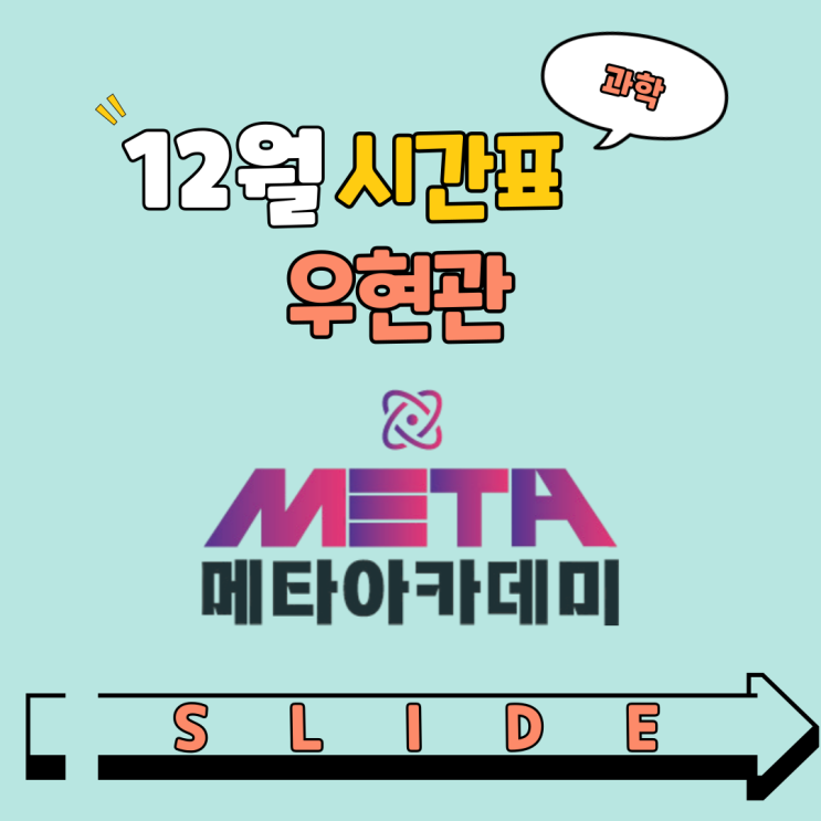 수학, 과학 전문학원 메타아카데미입니다. 12월 시간표가 나왔으니 확인 부탁드립니다. ( 시간표에 없더라도 수업을 원하시면 상담주세요. ) 1월부터 알찬 수학 커리큘럼이 추가될 예정이오니 많은 기대 및 상담 부탁드립니다 <img src="https://blogthumb.pstatic.net/MjAyNTExMjVfMTEx/MDAxNzY0MDc5MjkzMDIz.rCyMVERC9yKEpVftNWSau9d460ic6DNpvj2VD8Bt9IMg.I_TOcEOzBPMvx-nIL663dNv5zGgAkIKzQlZecJphy-wg.PNG/001.png?type=s3" />