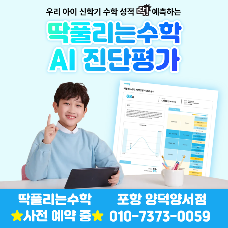 안녕하세요! 양서초, 양덕초, 송곡초, 장원초, 장흥초 학생들의 수학 고민을 시원하게 해결해 줄 딱풀리는수학 포항 양덕양서점입니다 지난 7월 진행된 딱풀리는수학 AI 진단평가가 학부모님들의 뜨거운 관심으로 큰 호응을 얻었는데요. 그 성원에 보답하고자 앵콜 이벤트를 준비했습니다! 겨울 방학 직전, 우리 아이 수학 실력을 점검할 최고의 기회! 한 해 동안 달려온 학습 내용을 점검하고, 다가올 새 학기를 대비하기 딱 좋은 시기입니다. ✅ 다음 학기 예상 점수 분석 ✅ 우리 아이 수학 MBTI 제공 ✅ 비상교육의 AI 분석 결과 제공 국내 대표 에듀테크 기업 비상교육의 기술력으로 정확하고 친절한 진단 결과를 받아보세요! ....... <img src="https://blogthumb.pstatic.net/MjAyNTExMjVfMjI2/MDAxNzYzOTk2ODc2NTgz.O9HYl8XvoPJzonRFyLvWGroM86RTllw1Qne3GZKtOeEg.YUs7YnNvCUaezJwqjBLuUEixn-HEzSi1ddv7c0JaLoYg.PNG/1.png?type=s3" />