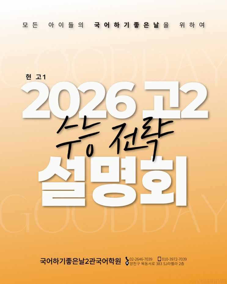 안녕하세요. 국어하기좋은날입니다. 내신과 정시의 기로에 선 2026 고2(현 고1)를 위한 수능 전략 설명회가 진행됩니다. ✔️ 2026 고2(현 고1) 커리큘럼 소개 ✔️ 새 교육과정과 입시 전략 재설계 ✔️ 2026 목표 및 전략 안내 28년 대입 방향을 결정할 새로운 커리큘럼 고난도 시험을 통한 수능 실전 감각 극대화 고3 평가원 지문을 통한 수능형 접근과 사고력 심화 국어하기좋은날의 시그니처 1:1 밀착 관리 시스템 ⭐설명회 참석 특전⭐ 비재원생 실전 모의고사 1회 응시 기회 + 학생 풀이 기반 분석 상담 12월 18일(목) 오후 7시 30분 국어하기좋은날2관(양천관) 학부모님들의 많은 관심과 참여 부탁드립니다. 모든 아이들의 국어....... <img src="https://blogthumb.pstatic.net/MjAyNTEyMDVfOTgg/MDAxNzY0OTEyMjYwNjI5.FO_u5yAYuh-MObeDiuY0nmA7tyAJL219609mRUEwHz4g.LIKYjUV8SBJLITKMCpAcd0cNwlM5-CoEskO01v2w2UQg.PNG/KakaoTalk_20251204_182224939_04.png?type=s3" />