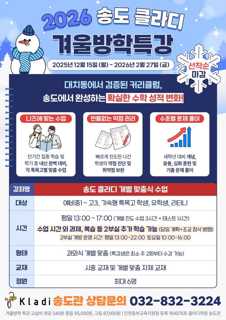 안녕하세요! 송도 클라디 학원입니다. 2025년 12월 15일부터 2026년 2월 27일까지 겨울 방학 특강을 실시합니다. 겨울방학 특강 기간동안에는 1.테스트 기반 정밀 진단 후 학생별 맞춤 진도 구성 2.기본 개념부터 심화·응용까지 단계별 유형 학습 시스템 3.개인 목표에 맞춘 일일 점검 + 기출 유형 집중 점검 테스트 4.완전히 이해할 때까지 확인하는 체계적인 오답 관리 를 진행합니다. 수업 시간은 13~17시 고정으로, 월~금요일 중 희망 요일을 선택하실 수 있습니다. (월 6회 이상부터 신청 가능합니다.) 자세한 내용은 상단 이미지 또는 학원으로 전화 주시면 더 친절하게 안내해드리겠습니다. :D 감사합니다! 송도 수학학원 클라디학원 송도....... <img src="https://blogthumb.pstatic.net/MjAyNTEyMDZfMjc2/MDAxNzY0OTk5MDE3MjA1.2QN7ly_TzaOnkNBk4eoBNf4rAAufW36Ic706MGwI0qgg.0eiCbeHWYLtfVSlBv_cXSXm63vept5B5xMpXOatj1Tcg.JPEG/%3F%86%A1%3F%8F%84%3F%81%B4%3F%9D%BC%3F%94%94_2026_%EA%B2%A8%EC%9A%B8%EB%B0%A9%ED%95%99_%3F%9B%B9%3F%9A%A9.jpg?type=s3" />