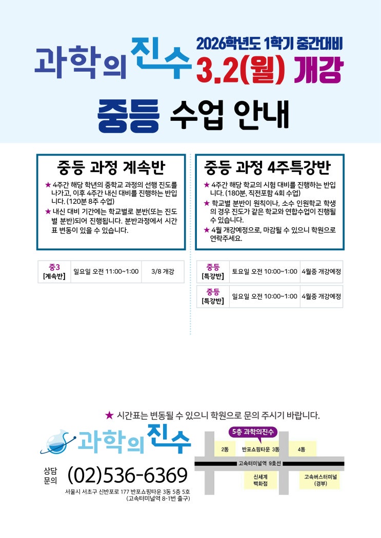 안녕하세요 과학의진수입니다. 중학교 1학기 중간고사 시간표 안내드립니다. 중학교 내신 수업은 3시간씩 총4회 진행(주1회 수업)되며, 개강일은 3월 말~4월초 예정입니다. 학사 일정이 나오는대로 개강일은 확정해서 업로드하겠습니다. 시간은 주말(토요일 or 일요일) 오전 10~ 오후1시에 진행되며, 학교별로 분반하여 진행됩니다. 알림을 받고 싶으신 분들은 학원으로 전화주셔서 연락처를 남겨주시면, 개강이 확정되는 대로 문자로 안내드리겠습니다. 자세한 문의는 학원 (02 536 6369)으로 연락 부탁드립니다. 감사합니다.^^ #서초구과학학원 #잠원동과학학원 #고속터미널과학학원 #고터과학학원 #소수정예 #과학학원 #중등과학 #신반포중 #경....... <img src="https://blogthumb.pstatic.net/MjAyNjAyMjZfMjUy/MDAxNzcyMTA0MTMxMzM1.FY1vLuRhkQNVZuugeLiZX3c2k4Rb9GCgRHZ6kOWJsLwg.nvcRgYgkFnIGmU9mzBU7Cfz3YKsDzCH2vaZki4xxATQg.JPEG/2026_3%BF%F9_1%C7%D0%B1%E2_%C1%DF%B0%A3%B0%ED%BB%E7_%B4%EB%BA%F1_%B0%B3%B0%AD_%BD%C3%B0%A3%C7%A5%28%C1%DF%B5%EE%C3%DF%B0%A1%2917.jpg?type=s3" />