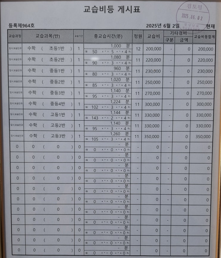 창원 수학 온리원수학학원 교습비