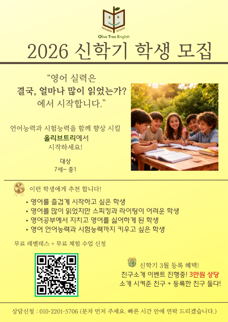 2026년 신학기 학생 모집 안내/무료 레벨테스트/친구소개 이벤트
