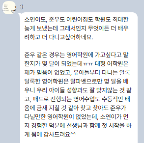 늦게 시작해도 괜찮습니다 영어의아침에서 다시 시작한 두 아이 이야기 “소연이도, 준우도 어린이집과 학원을 최대한 늦게 보냈는데 그래도 영어는 더 배우라고 더 다니고 싶어하네요.” 최근 학부모님께서 보내주신 메시지입니다. 사실 요즘은 영어를 아주 어릴 때부터 시작하는 경우가 많습니다. 그래서 “우리 아이가 늦은 건 아닐까?” 걱정하시는 부모님들도 많습니다. 하지만 영어는 시작 시기보다 ‘어떻게 배우느냐’가 훨씬 중요합니다. 대형 영어학원에서 적응하지 못했던 준우 준우는 예전에 대형 영어학원을 다닌 적이 있었습니다. 하지만 아이에게 맞지 않는 방식이었고, 결국 탈락 통보를 받았습니다. 그 이후 영어에 대....... <img src="https://blogthumb.pstatic.net/MjAyNjAyMTlfMTQz/MDAxNzcxNDgzMjIzOTYz.k9hfk-LdV0W7vJLlTkkkCe2XZ9T4wkeaUqle-s-XNxog.-zxJPflJPpGJw7Ud_2MguvkhjZ449_9CXdYN-KKcvvMg.PNG/%BC%DB%BC%D2%BF%AC_%C1%D8%BF%EC_%BE%EE%B8%D3%B4%CF_%C8%C4%B1%E2_260219.png?type=s3" />