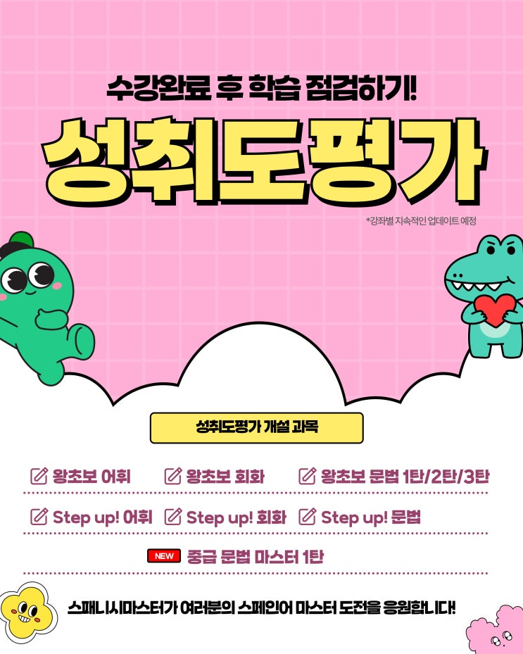 수강 완료 후 학습 점검하기 성취도평가 ¡Hola a todos! 스패니시마스터입니다 ✨ 스패니시마스터 수강생 여러분들이 학습효과를 높일 수 있도록 강좌별 '성취도평가'가 추가되었습니다. 학습 진도율 70%이상부터 성취도평가에 응시할 수 있으며 응시 후 복습이 필요한 강의 안내도 해설과 함께 확인하실 수 있습니다. 여러분들의 스페인어 학습에 조금이라도 도움이 될 수 있었으면 좋겠습니다. 성취도평가가 가능한 강좌를 지속적으로 업데이트할 예정이오니 많은 관심 부탁드립니다. 성취도평가 개설 과목 왕초보 어휘 왕초보 회화 왕초보문법 1탄/2탄/3탄 Step up! 문법 Step up! 어휘 Step....... <img src="https://blogthumb.pstatic.net/MjAyNjAyMjBfMjMw/MDAxNzcxNTY1NTk0MTQx.33MIe3su9NzZVQCbW9VaTWWMmw-bJ7KELnQrajxBLccg.hvB7Vpv503M4H-OvvTVNY32m7eid3g3M0_iLh6RDvvgg.JPEG/%C1%A6%B8%F1%C0%BB-%C0%D4%B7%C2%C7%D8%C1%D6%BC%BC%BF%E4_-005_%281%29.jpg?type=s3" />