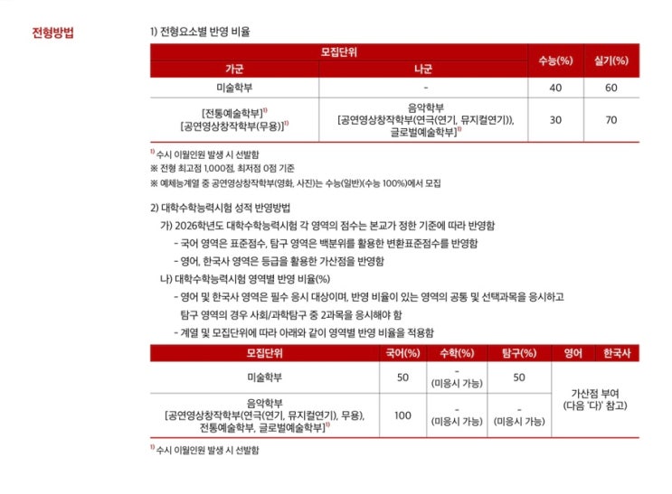 중앙대학교 정시 전형에 대해 정리해 보겠습니다. 수능•실기 반영비율 * 수능 : 40% * 실기 : 60% 실기가 절대적으로 중요한 구조라 합격은 실기 점수가 좌우합니다. “성적이 조금 아쉬워도 실기로 충분히 뒤집을 수 있는 학교”이지만, 반대로 실기 준비가 부족하면 합격을 기대하기 어려운 학교이기도 합니다. 수능 반영 방식 국어 : 50% • 탐구 : 50% (수학 미응시 가능) 영어 : 등급별 환산 점수 반영 한국사 : 가산점 반영 영어와 한국사는 등급에 따라 점수가 반영됩니다. 영어는 4등급에서 6등급 사이의 점수 차이가 커서, 실기 실력이 비슷한 경우 당락을 가르는 요소가 될 수 있습니다. 반면 한국사는 5등급까지 감점이 없고, 1등급....... <img src="https://blogthumb.pstatic.net/MjAyNTEyMDRfMjE3/MDAxNzY0ODIwNjQ1MTAy.kxLU2WSEiW17IaglkJsoL7gQBBij3UylzC1VqRT31KQg.ll67nPQXYl35s1wpA1VhzdgLkZifz81oKSY7NdzIBZwg.JPEG/IMG%A3%DF2894.jpg?type=s3" />