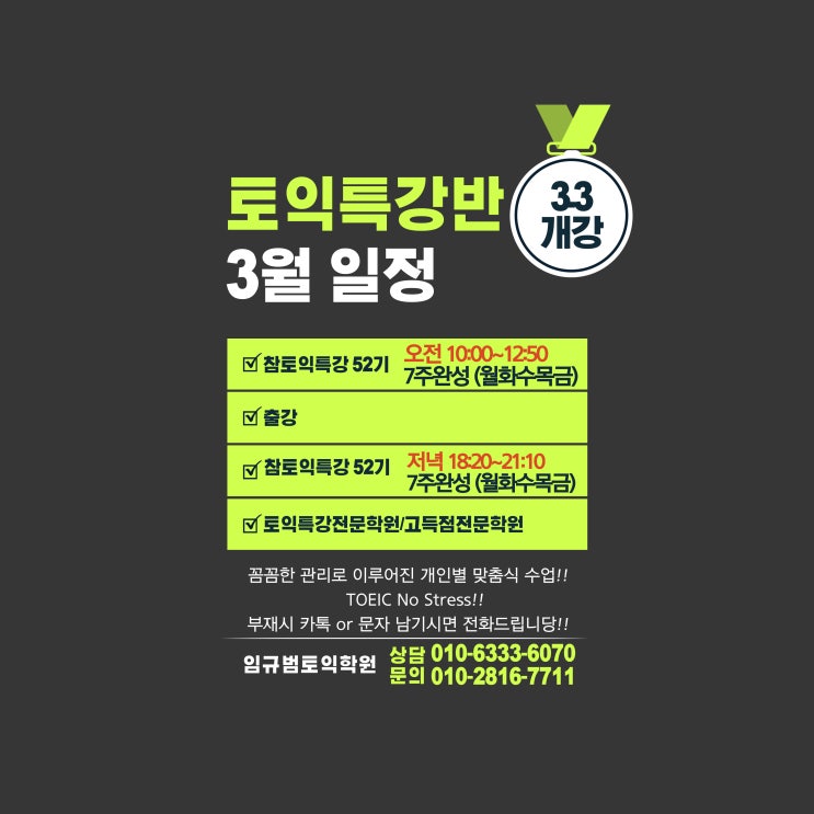 안녕하세요~:) 참선생 임규범입니다. 2026년 3월 개강 시간표 올려드립니다!! 상담시간 13:00-18:00 전화상담/방문상담 참토익 51기가 "20일" 종강이라 방문상담인경우 "23일" 부터 가능하세용!! 전화 주셨는데 부재중이라면 문자나 학원 학원카톡으로 연락 주시면 확인 후 연락드리겠습니다. *방문상담인 경우 꼭 전화주세요!!* 임규범토익학원 오픈카톡 https://open.kakao.com/o/sfeJSvsc 학생들이 존중받는 강의를 하고 싶습니다!! 참토익 51기가 열심히 마지막 불꽃을 태우고 있는 중입니다. (마지막 점검중!!) 참토익 51기들 이야기를 하자면 처음시작할 때 평균420점으로 시작해서 한달 지난 뒤 평균630(오전:600/오....... <img src="https://blogthumb.pstatic.net/MjAyNjAyMTJfMjYg/MDAxNzcwODU2NjI3ODAw.2Axye9hX5ErnmhJ0iJ5Jch5tpkaWJgOVcPgwaYc5U4cg.K6yL5zZbar5PAXvppQosIolC7zqNuQPQAgjPGRegkyAg.JPEG/26%B3%E2_3%BF%F952%B1%E2.jpg?type=s3" />
