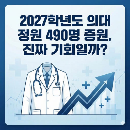안녕하세요~ 최근 정부가 2027학년도 의대 정원 490명 증원 계획을 발표하면서 입시 환경이 다시 한 번 크게 움직이고 있습니다. 2024년 2,000명 증원 발표 당시와 달리, 이번에는 과학적 수급 추계와 절차적 정당성을 갖췄다는 점에서 실제 시행 가능성이 높다는 분석이 나오고 있습니다. 특히 이번 정책 변화는 단순히 “의대 문이 조금 넓어진다”는 의미를 넘어, 앞으로의 입시 전략 자체를 바꿀 수 있는 중요한 신호로 볼 수 있습니다. 그래서 오늘은 의대를 목표로 하는 학생이라면 지금부터 준비 방향을 점검해야 하는 이유를 국쎈 블로그를 통해서 알려 드리고자 합니다. 1. 의대 정원 확대, 숫자보다 중요한 변화 이번 발표에서 가장 주....... <img src="https://blogthumb.pstatic.net/MjAyNjAyMTNfMjI5/MDAxNzcwOTU2MDc1NTI5.ZO4ngpZ1M_8oIoScN3Qjy_3zp-J8y5ElAJp5pTsIoQYg.iXzFO51FeMw_3duac40CHy7nl8lJ6cEuAXZDEkWSXK8g.JPEG/%B4%D9%BF%EE%B7%CE%B5%E5_%286%29.jpg?type=s3" />