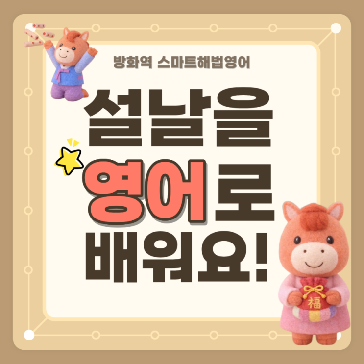 어느덧 민족 대명절 설날이 다가왔습니다. 방화동영어학원 방화역 스마트해법영어에서는 설을 맞아 방화동초등영어 치현초 삼정초 정곡초 초등부 학생들과 설날 영어 표현을 배우는 시간을 가졌습니다. 숙제 검사 시간을 활용해 세배, 세뱃돈, 떡국, 새해 덕담과 결심까지 영어로 배워보았습니다. 연휴가 길어 교재 진도도 챙기면서, 짧은 시간이지만 알차게 구성한 작은 이벤트 수업이었습니다. 평소 교재로만 배우던 영어를 우리 문화 속 이야기로 풀어보니 방화동학원 방화역 스마트해법영어 아이들의 수업 집중도도 더욱 높아졌습니다. 1. 설날(Seollal)은 영어로? 설날은 음력 1월 1일, 새해 첫날을 기념하는 우리나라의 큰 명절입니다. 영....... <img src="https://blogthumb.pstatic.net/MjAyNjAyMTRfMTAx/MDAxNzcxMDQ1OTE2NDAx.r2qbhx1SEcBSoper-0i-ugvuMIouvmN-NvkkgXpovPMg.H2Nsyu8Ob7dZG-lZxehDu9o6hkVR8aD-QfaBFrxAzKUg.PNG/900%A3%DF%BF%CD%B1%DB%A3%DF%BC%B3%B3%AF%BC%F6%BE%F71.png?type=s3" />
