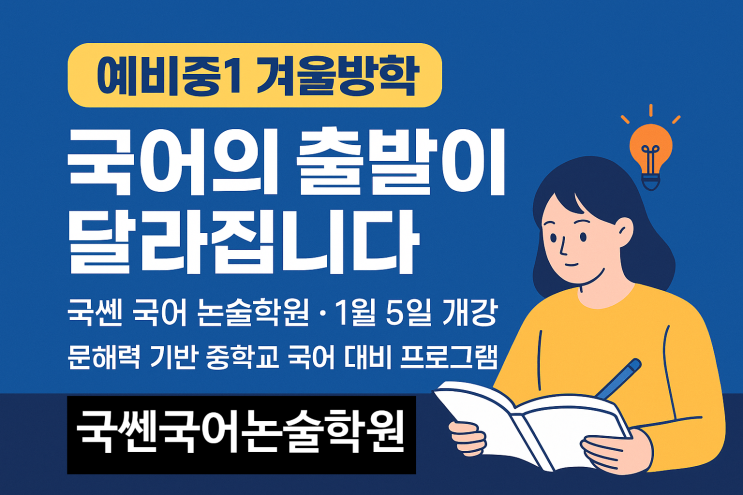 여러분 안녕하세요~ 오늘은 초6 자녀를 둔 부모님들이 솔깃할 만한 소식을 가져 왔습니다. 바로바로바로~~ 우리 아이가 첫 국어시험에서 흔들리지 않고 우수한 성적을 거둘 수 있는 방법에 대해서 말씀드릴게요. 국쎈 국어 논술 학원 겨울방학 예비중1반 모집 안내 – 문해력의 골든타임, 중학교 입학 전 지금이 결정적 순간입니다 초등 6학년 학생들이 곧 ‘예비중1’이라는 새로운 이름을 갖게 될 시기입니다. 특히 국어 과목은 중학교에 올라가는 순간 시험의 형식과 학습 방식이 크게 바뀌기 때문에, 이 시기의 준비 여부가 입학 이후 성적을 가르는 경우가 많습니다. 국쎈 국어 논술학원은 해운동에서 15년 동안 학생들을 지도해 오며 마산....... <img src="https://blogthumb.pstatic.net/MjAyNTEyMTBfMjc1/MDAxNzY1MzI0ODQ0MDU1.KNnGARz5-gkF6cUQlL885ArYJsHdLShsyRvdBA-kpJwg.W3Et4Tod4D3e5mSP4oRCmlXAZLube0zbptnQe5MOFUMg.PNG/ChatGPT_Image_2025%B3%E2_12%BF%F9_10%C0%CF_%BF%C0%C0%FC_08_57_35.png?type=s3" />