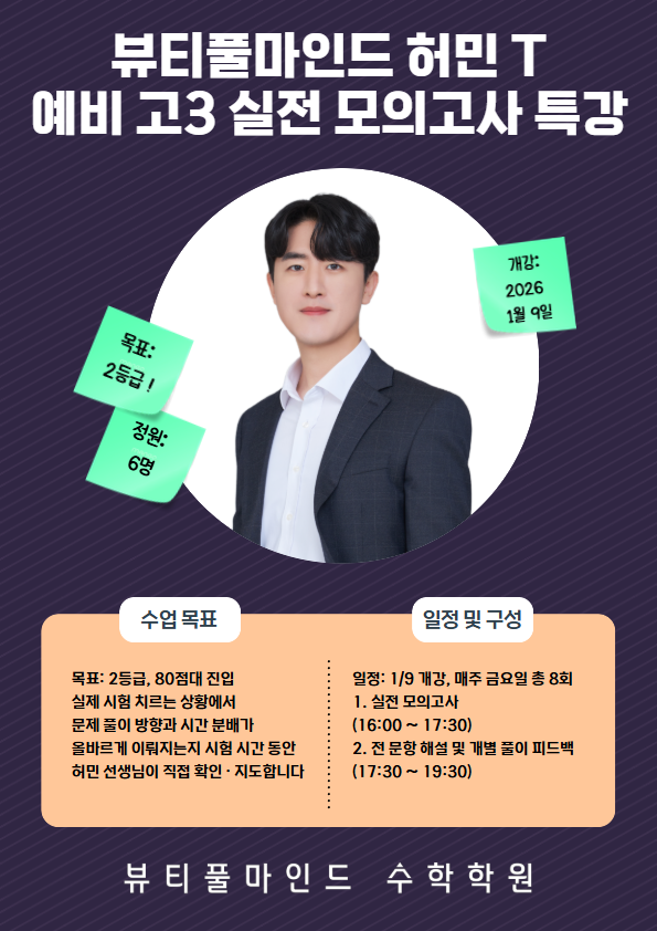 (본 특강은 인원 마감 되었습니다.) [[수학 모의고사 특강반 안내]] 예비 고3 학생을 대상으로 모의고사 운영과 풀이 과정을 함께 점검하는 특강이 개설 되었습니다. ✔️수업 목표 및 방향 목표: 2등급 / 80점대 진입 실제 시험 상황에서 문제 풀이 방향과 시간 분배가 올바르게 이뤄지는지 시험 시간 동안 담당선생님이 직접 확인·지도합니다. ✔️ 수업 일정 · 구성 개강: 1월 9일(금), 매주 금요일 총 8회 실전 모의고사 진행 (16:00 ~ 17:30) 전 문항 해설 및 개별 풀이 피드백 (17:30 ~ 19:30) (정답 포함하여 모든 문항 풀이점검) ✔️ 인원 6명 제한해서 수업합니다. 문의 02)6338-1210 010-2068-1986 <img src="https://blogthumb.pstatic.net/MjAyNTEyMjJfNSAg/MDAxNzY2Mzk4MjgxNzIx.THd9oF0EcO6BxWsQluBejkiqaaUR0qoDmQdZcba6T8Yg.TXrpDlOdz8UTP6lb_8kXViH_fSR5lTnH9IXSIq-hQRog.PNG/%BA%B9%BB%E7%BA%BB_%BA%B9%BB%E7%BA%BB_%C1%A6%B8%F1%C0%BB_%C0%D4%B7%C2%C7%CF%BC%BC%BF%E4_%2890%29.png?type=s3" />