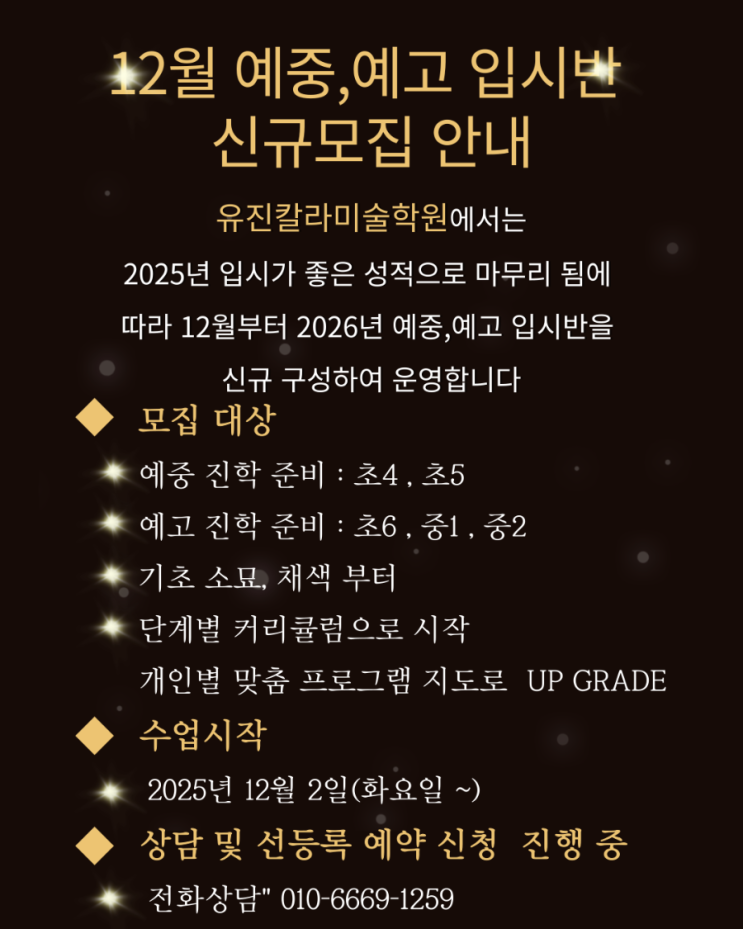 안녕하세요 ~~ 유진칼라미술학원 입니다. 합격률로 증명하는 유진칼라미술학원에서 예중 예고 예비반 친구들을 모집합니다. ❤️ 평소에 그림에 관심이 많았던 친구들 ❤️낮은 실기력으로 고민하는 친구들 ❤️스트레스를 그림으로 푸는 친구들 ❤️공부에 흥미보다는 그림쪽으로 관심이 더 가는 친구들 다~~~~모여라^^ 양산 연속 최다합격! 즐길줄도 알고 그림도 열심히 잘~그리는 이삐들이 되었음 합니다. 그렇기에 즐거운 일을 수업을 만들어 주는 선생님이 있습니다. 즐기면서 그림 잘 ~~그리는 아이들이 있는 유진칼라미술학원 ❤️ #양산입시미술학원 #울산입시미술학원 #정관입시미술학원 #장유입시미술학원 #화명동입시미술 #물금입시미....... <img src="https://blogthumb.pstatic.net/MjAyNTExMTlfMTYw/MDAxNzYzNTM1MjMxNjQx.2lEKsACiaeIgr9paIi9cKZObczmPg_4ZwfwOqj6hqVMg.IyhigrHp4VzuaSc_w4g0ADo4lUoNd6XLEAojL8-oObcg.PNG/900%A3%DF1763531887236.png?type=s3" />