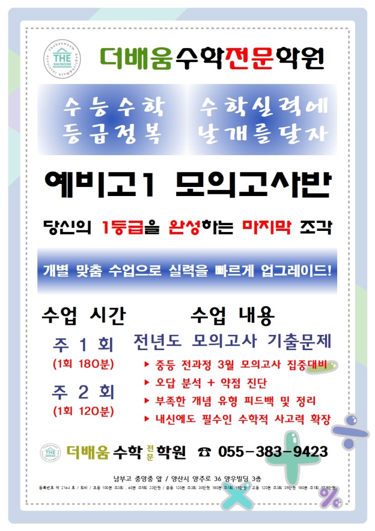 양산 남부동 더배움수학 예비고1 모의고사반 모집