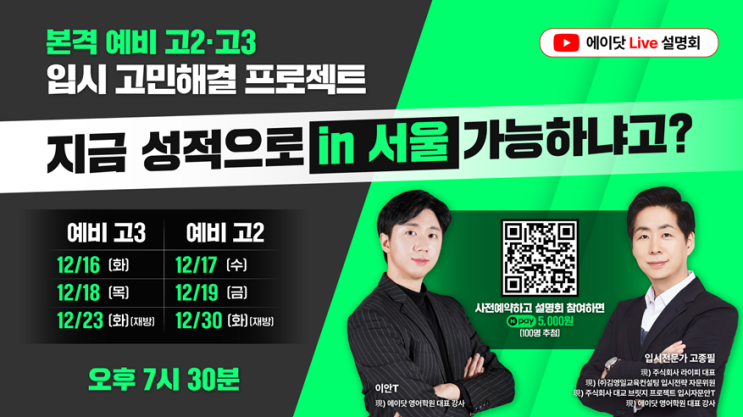 안녕하세요 에이닷 영어학원 원장 김지환입니다 슬슬 시험 막바지가 보이는데요! 아무래도 이번 시험은 학기, 학년이 끝나는 시험이다 보니 시험 이후 해야할 일들이 많습니다! 많은 학생들의 첫번째 고민은 내 성적으로 어느 대학교를 갈 수 있는지 일텐데요! 그래서 바로 준비했습니다! 예비 고3 입시설명회는 - 26학년도 수능 총평 - 26학년도 입시로 바라보는 27학년도 대입 전망 및 전략 - 나에게 맞는 대입 전형 찾는 법 - 대입 성공 로드맵 - 겨울방학, 역전의 학습 루틴 만드는 법 예비 고2 입시설명회는 - 26학년도 수능 총평 - 28학년도 대입 이슈 (정시 내신 반영 증가, 고교학점제 영향 등) - 주요대학 2028 입학전형 주요 사항....... <img src="https://blogthumb.pstatic.net/MjAyNTEyMDVfMTUx/MDAxNzY0OTE4MjQ0MDE0.78Ixc-KXKtAf4DFxQf5Tplzm1aOdfIUTmIwB_S6SDckg.mIlcS9Yyb45rqaRs4X-N2zdJKHsVbmwsi11ofoz1MY8g.PNG/image.png?type=s3" />
