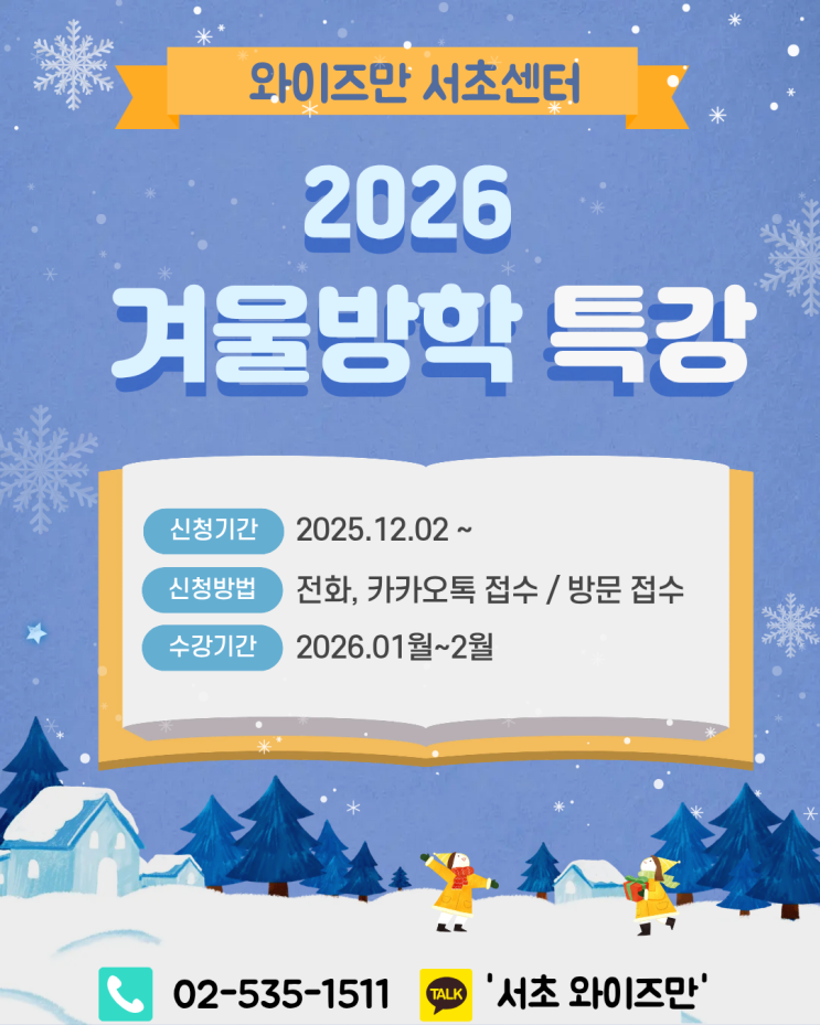 2026년 겨울방학 중등 수학 · 과학 특강 안내 안녕하세요 와이즈만 서초센터입니다^^ 겨울방학이 한달 앞으로 다가왔습니다. 이번 겨울방학을 이용해 학습 성취도를 향상시키고 싶은 학생들이 많을겁니다. 학생들의 다양한 영역에서의 성장을 위한 특강들이 준비되어 있습니다. 아래 특강 내용을 확인해보시고 우리 학생에게 가장 필요한 특강으로 이번 겨울방학 와이즈만 서초센터와 함께 보람찬 시간을 보내보세요~ < 예비 중1 이상 특강 > 1. 중등 수학 특강 ① 중1-1 수학 중등심화 4주 완성 * 일시 * 1/12(월) ~ 2/6(금) (월, 수, 금) 주3회 / 4주 12회 완성 오전 11:00 ~ 오후 1:00 * 대상 * 예비 중1 학생 * 내용 * 예비 중1을 위한....... <img src="https://blogthumb.pstatic.net/MjAyNTEyMDZfMTEw/MDAxNzY0OTk1ODkxNTQ0.jmmDGaO5DF9l_NYcry1Fml7Noa8wbL8l6azEL8ejB5Ag.buGYQnt4kZWLuqEU13k9YewXmQjXReg8TLgk8DeHgjAg.PNG/1.png?type=s3" />