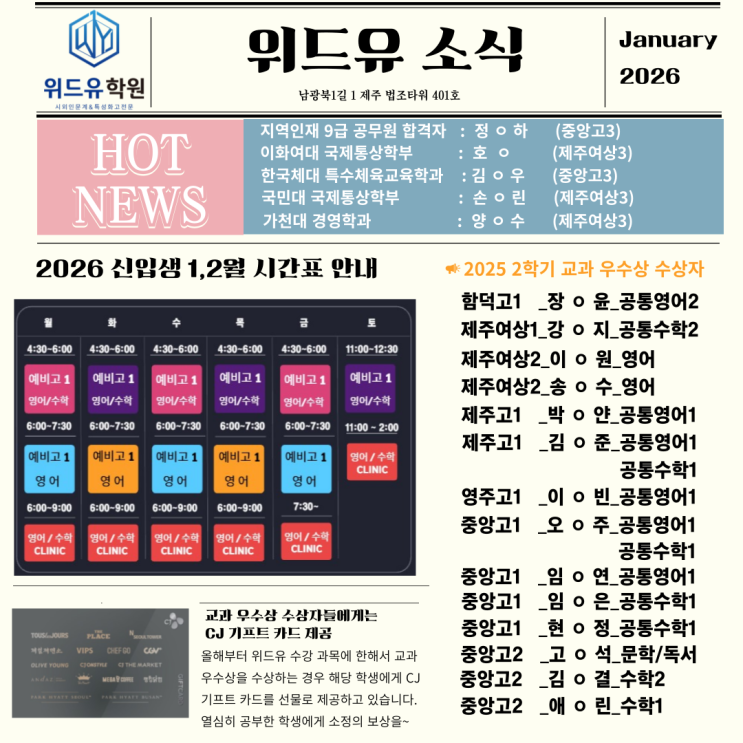 위드유 학원은 2020년 12월 24일에 학원 설립 및 운영등록 증명서가 나왔고, 27일에 사업자 등록증이 나왔습니다. 만 5년 되었습니다. 많은 성과도 있었고, 쓴맛도 봤지만 올해 고3 친구들과 같은 입시 결과는 처음입니다. 정말 다수의 학생들이 좋은 입시 결과를 받았지만 그 중에서도 주목하고 싶은건 1. 지역인재 9급 공채 합격생 (중앙고3 정 ㅇ 하) 3년 내내 학생회 활동을 하면서 학교 생활도 열심히 학원수업도 성실하게 참여했던 친구입니다. 제주대학교에도 합격했으나 본인의 뜻에 따라 공무원의 길을 시작하기로 했습니다. 2. 이화여대 국제통상학부 (여상3 호 ㅇ) 우리 학원에서 이화여대 학생이 다 나왔습니다. 경사 중에 경사입니....... <img src="https://blogthumb.pstatic.net/MjAyNjAxMTRfMTY1/MDAxNzY4Mzg3ODI0NjQ1.jkKdKQ9NR2NI099nIoApjVwZudKrz4BQAcsg1EAJ-okg.rE8sS8kwXILe-KPv4f8LhJDjHbFTGE6M9J40H4UJkogg.PNG/001.png?type=s3" />