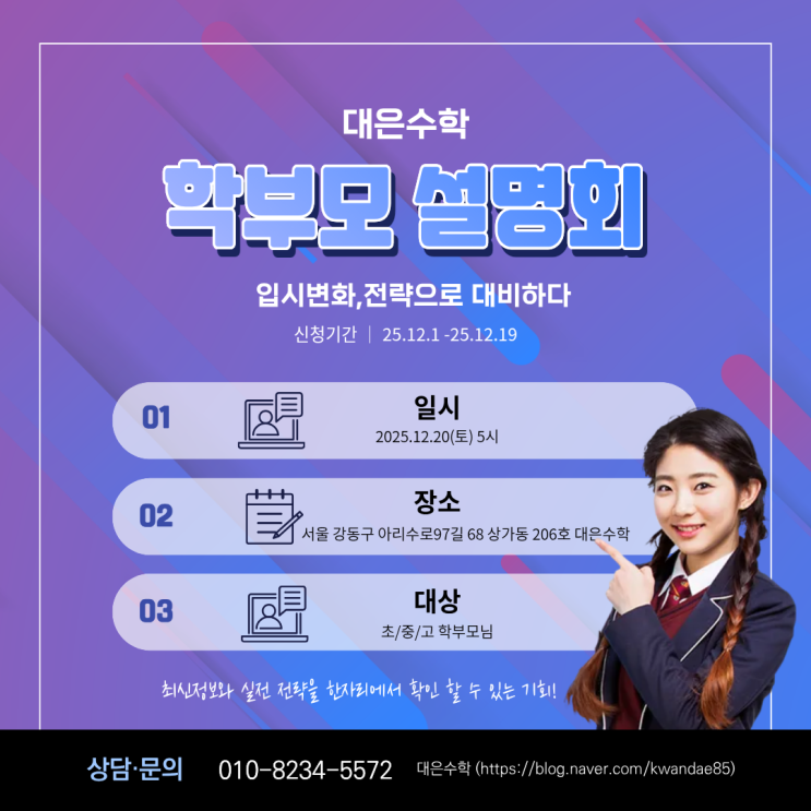 안녕하세요~ 대은수학입니다^^ 어느덧 12월 4주차를 맞이하고 2026년도를 곧 바라보는 마지막 주차가 지나가고 있습니다. 여러분들을 한해를 어떻게 보내셨나요? 저는 이번년도는 교습소를 오픈하고 정신없이 운영하며 지냈던 기억밖에는 없는것 같습니다. 그만큼 애정을 가지며 운영을 했다는 것인데 나름 보람되기도 하고 반성도 하게되는 한해였던것 같습니다. 오늘은 12/20(토)에 진행된 학부모 설명회와 12월 산타킹 이벤트 그리고 대은수학의 귀요미 마스코트가 찍은 '대은수학의 등원부터 하원까지' 영상을 소개하려 합니다. 아이들이 등원해서 부터 하원까지 어떠한 모습으로 그리고 무엇을 배우는지 과정을 영상에 담아 보았....... <img src="https://blogthumb.pstatic.net/MjAyNTEyMjRfMTgg/MDAxNzY2NTQ4ODAxNTI3.6kp2ZZrKWzAXXV5_2yEGAqzvJb4zNc18t7vyZq5xzoEg.7ce-twwA2jnpYQL3KzrFzDhSiecH26yWrPYKEUOD7usg.PNG/KakaoTalk_20251224_125525914.png?type=s3" />