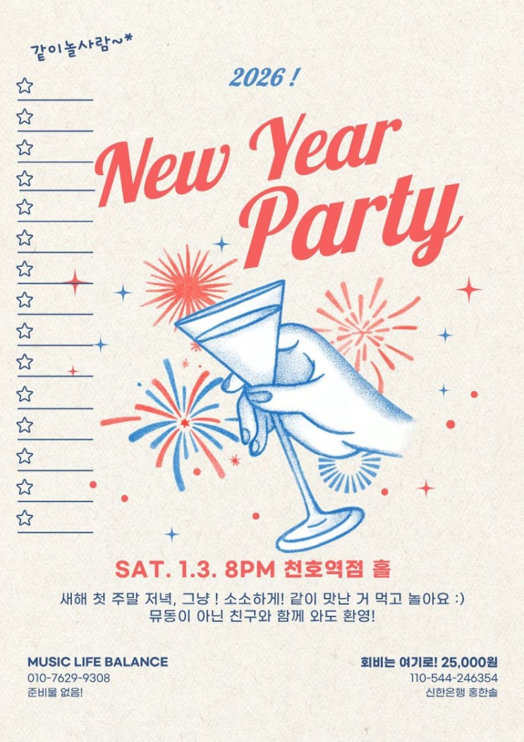 안녕하세요 뮤동이 여러분 뮤라벨입니다! 2026년 1월 3일 토요일! 학원에서 수강생분들과 함께 조금 특별한 시간을 보냈습니다 정해진 수업 없이 다 같이 편하게 모여 이야기 나누고 음악 얘기도 하고 그냥 쉬어가는 느낌의 모임이었습니다 뾰로롱~~~ 많은 수강생분들이 참여해주셨어요 뮤직큐는 수강생분들이 맘껏즐길 수 있도록 와인과 음식들을 마음껏 준비했어요♥️ 성인 음악학원이다 보니 각자 바쁜 일상 속에서 시간을 내어 오시는 분들이 많았는데요 그래서인지 이런 날은 더 소중하게 느껴져요 ㅜ.ㅜ 갑작스러운 이런 파티 모두 어떠셨나요? 깜짝파티는 갑자기 찾아오니 다음번에도 많은 참여 부탁드려요 뮤라벨피....... <img src="https://blogthumb.pstatic.net/MjAyNjAxMDdfMjMx/MDAxNzY3Nzc0MTQ3Nzcz.zhh936ybJ-HrZmEo3Ms7paQWVpnQ_-Us9mgeYlLJR0Ig.VXtZjoqCsKlpk3ZIPm_HjEAmCJj8KjIWscPaKeK3HC4g.JPEG/IMG%A3%DF8492.JPG?type=s3" />