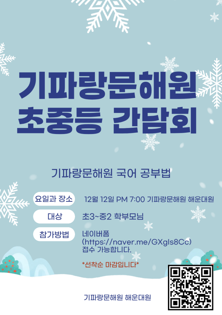 본격적인 기파랑 문해원 입학 시즌입니다. 26년 새학기는 25년 12월 31일에 시작됩니다. 기파랑 문해원 해운대원에 대해 소개하고자 26년 기파랑 문해원 해운대원 간담회 접수합니다. 기파랑 문해원 수업과 국어 학습을 주제로 간담회가 진행됩니다. 기파랑 문해원 해운대원에 대해 평소 궁금하셨던 어머니들 꼭 참석해 주세요. 참석자 전원에게 혜택도 있습니다. 어머니들의 정확한 정보가 아이들의 학습의 지름길을 열어 줍니다. 저녁 간담회 편하게 오셔서 다양한 이야기를 나누도록 기다리고 있겠습니다. 신청은 아래 주소 클릭 https://naver.me/GXgIs8Cc * 신청 취소는 3일 전까지 다른 대기자를 위해 미리 연락을 주세요. 노쇼는 다음 설....... <img src="https://blogthumb.pstatic.net/MjAyNTEyMDRfMTUg/MDAxNzY0ODI2MzI4MDQz.erDTsCVQEuNu2SiMvUCIQ8Q87ieWn2V4E9J_sv6aaAIg.Ly0SI6ywR9W-9bRYQfRoBBvsnsVK9DsxKn22sVCSPEcg.PNG/%B1%B9%BE%EE%C0%C7%BB%D1%B8%AE_%282%29.png?type=s3" />