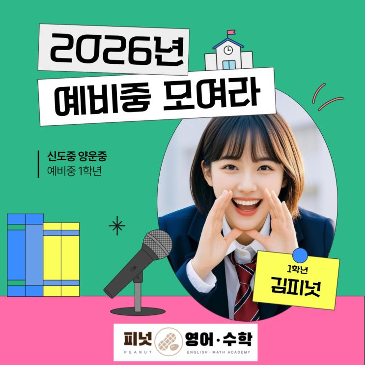 안녕하세요 #신도초 #양운초 #신도중 #양운중 #신도고 #양운고 #영어 #수학 전문 학원 #피넛영어수학 학원입니다! 2026년 입학 예비중1학년 모여라! 2026년이 얼마 남지 않았습니다! 현 초등학교 6학년 학생들은 얼마 후면 어엿한 중학생이 됩니다. 중학생이 되면 많은 것이 달라집니다. 매년 시험과 성적을 고민해야 하고 진로와 미래를 준비해야 하는 본격적인 공부가 필요한 시기입니다. 피넛은 중등 과정을 시작하려는 학생들을 바른 길로 인도하기 위해 예비중 과정을 개강합니다 중1 기초반 아직도 중1 과정을 시작하지 않은 신도초 양운초 6학년들은 주목해 주세요! 영어 수학 모두 중등 공부를 처음 시작하는 학생들을 위한 개강반이 1월....... <img src="https://blogthumb.pstatic.net/MjAyNTEyMDRfNzUg/MDAxNzY0ODUwNDIzODA0.Hcezl4fvRYHmtoQutd3IQnwIM1dMKll7JAaun1O4I10g.MyceM5-clx3Rrz-rvkLkHyMLlfp8vjSctPYd046eP2og.PNG/%BF%B9%BA%F1%C1%DF_%B8%F0%BF%A9%B6%F3.png?type=s3" />