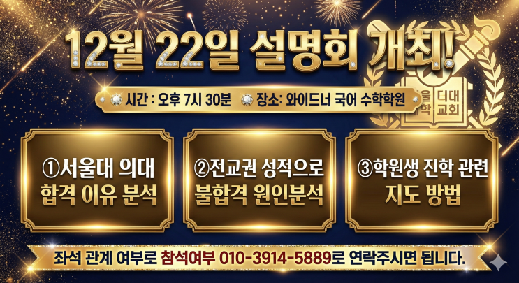 최상위권 입시, 단순히 성적만 좋다고 성공하는 것이 아닙니다. 서울대 의대 합격생과 전교권 성적임에도 불합격한 학생의 결정적인 차이는 무엇일까요? 와이드너 국어 수학학원에서 그 해답을 드리는 특별한 설명회를 준비했습니다. 설명회 안내 일시: 12월 22일 (시간: 오후 7시 30분) 장소: 와이드너 국어 수학학원 ✨ 주요 내용 ①서울대 의대 합격 이유 정밀 분석 ②전교권 성적 학생의 불합격 원인 분석 ③와이드너 학원만의 진학 관련 지도 방법 공개 참석 예약 (필수) 좌석이 한정된 관계로 사전 예약이 필요합니다. 참석을 희망하시는 분은 아래 번호로 문자 메시지를 남겨주세요. 예약 문의: 010-3914-5889 <img src="https://blogthumb.pstatic.net/MjAyNTEyMTVfMjgx/MDAxNzY1NzgxOTg2NTA1.gJYqTj_-qPtNNK_u1CZfCGM5O42KuL8F8TPHE5y3cDog.AY6hAkq6ZNKvie2zUwlTN1TRvYgJAE27cxFRUJwUC0Mg.PNG/%BC%B3%B8%ED%C8%B8_1.png?type=s3" />