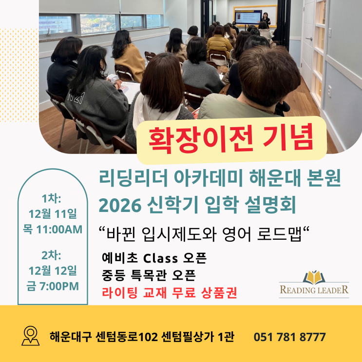 리딩리더 아카데미 해운대 센텀 본원 확장이전 기념 - 2026 입학 설명회 (라이팅 교재 무료 혜택)