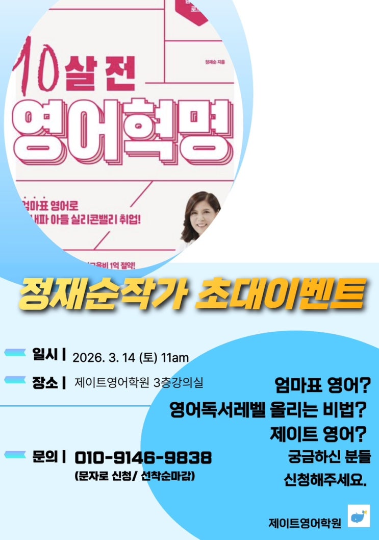 아이가 만10살 전이면 꼭 읽어봐주세요. 제가 학원을 하고 있는데요. 엄마표 영어를 학원버전으로 운영하고 있거든요. 영어 학원을 올해 9년차 운영하고 있는데요. 아이들 영어공부의 기준을 딱 세울 수 있고, 아이들 영어독서 레벨을 어떻게 올리는지, 그리고 영어과목 수능1등급을 어떻게 받을 수 있는지 알려드리고 싶어서 자리를 마련했습니다. 게다가 항상 대기가 많아서 들어가기 힘들다고 하는 제이트 영어학원의 교육도 엿볼 수 있는 기회입니다. (초등 1,2학년의 경우 참석하시면 대기없이 등록우선 혜택도 있어요.) (아! 그러시진 않겠지만, 학원관계자 분들은 사양합니다.) 2026년 3월 14일 오전 11시 제이트영어학원으로 오세요. 문....... <img src="https://blogthumb.pstatic.net/MjAyNjAzMDJfMjAw/MDAxNzcyNDA2NzM3NzEz.VZSMUCmJuFTRk2e6iqJfpoVmnO-oT8AzyEBwjrTNTAkg.xyutZYLc3SXjq5i3cFjn22Ai638Y6Tk30COmfylXMOUg.JPEG/IMG%A3%DF8742.JPG?type=s3" />