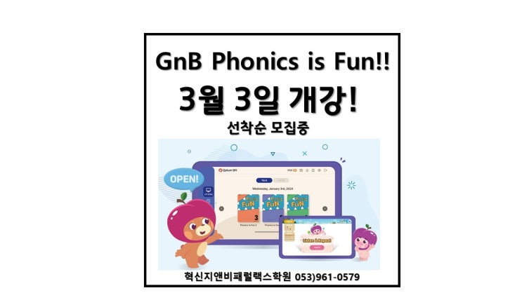 안녕하세요~!! 2026년 신학기 파닉스반 오픈합니다.!! 2026 신학기 ✨ 지앤비 파닉스 신규생 모집 ✨ 영어의 시작, 파닉스가 다르면 결과가 달라집니다. 왜 지앤비 파닉스인가요? 체계적인 파닉스 커리큘럼 알파벳 → 소리 → 단어 → 문장까지 읽고·쓰고·말하는 기초를 단계별로 완성 소리 중심 학습 (Sound-based Learning) 단순 암기가 아닌 ‘소리를 듣고 바로 읽는 힘’을 키워주는 파닉스 GnB 검증 교재 & 노하우 오랜 교육 경험으로 검증된 지앤비만의 파닉스 교수법 적용 소수 정예 & 밀착 지도 아이 수준에 맞춘 개별 피드백으로 처음 배우는 영어도 자신감 UP! 이런 친구에게 추천해요 ✔ 영어를 처음....... <img src="https://blogthumb.pstatic.net/MjAyNjAyMDVfMjkw/MDAxNzcwMjgyODUzODkz.A9zk2_qhdBPC_3pN7qK8JYNap1emY6CS2Gx2aw_dZcQg.daC4L-HFJ2FANwdsNjOrlCbhcrpAMIwci9RxoXz8AeIg.JPEG/%C6%C4%B4%D0%BD%BA_%B0%B3%B0%AD.jpg?type=s3" />