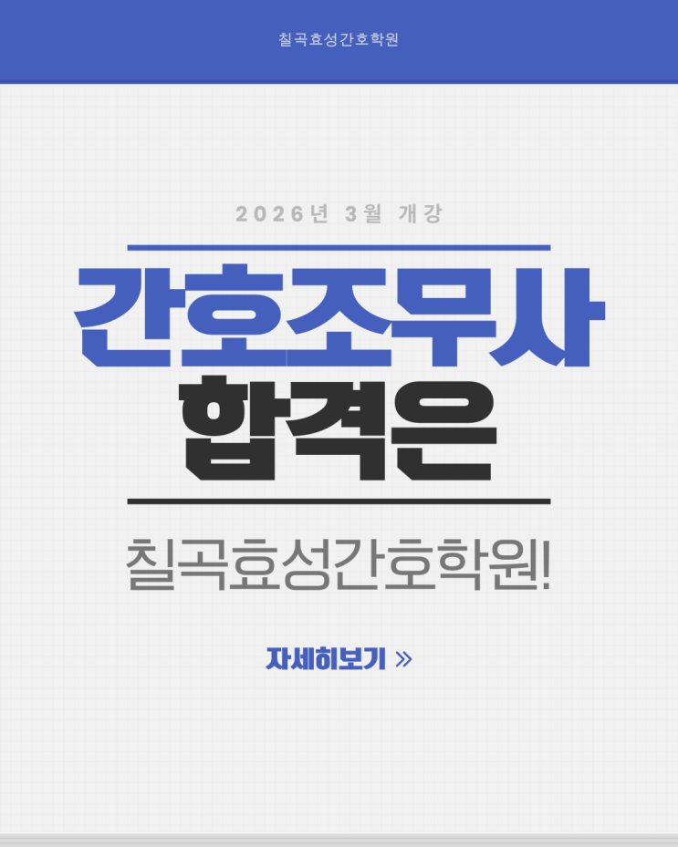 간호조무사 자격 취득을 목표로 학원을 알아보고 있다면, 교육 방식과 학습 흐름을 먼저 살펴보는 것이 중요합니다. 칠곡효성간호학원은 간호조무사 시험을 준비하는 과정에서 이론과 실습을 함께 구성한 수업을 통해 기본기를 다질 수 있도록 안내하고 있습니다. 칠곡효성간호학원의 수업은 간호조무사 시험 범위에 맞춘 이론 설명을 중심으로 진행됩니다. 단순 암기가 아닌 전반적인 개념 이해를 목표로 하여, 간호 관련 용어나 기본 지식을 차근차근 익힐 수 있도록 구성되어 있습니다. 처음 간호 분야에 도전하는 수강생도 수업 흐름을 따라가기 어렵지 않도록 설명 위주의 수업이 이루어집니다. 이론 수업과 함께 실습 수업이 병행되어, 배....... <img src="https://blogthumb.pstatic.net/MjAyNjAxMjdfMTk5/MDAxNzY5NDkyMzM4OTky.s3ia2xb4Bwav25aRuLXUhWVQdzH5tjJ4aTMmrodygFsg.c8AAwOc_WmyvE2fxXagz5ljXj8rStzm84BPXIPIm_Log.PNG/%C4%A5%B0%EE%C8%BF%BC%BA%B0%A3%C8%A3%C7%D0%BF%F8_3%BF%F9%B0%B3%B0%AD_%B0%A3%C8%A3%C1%B6%B9%AB%BB%E7%C7%D5%B0%DD.png?type=s3" />