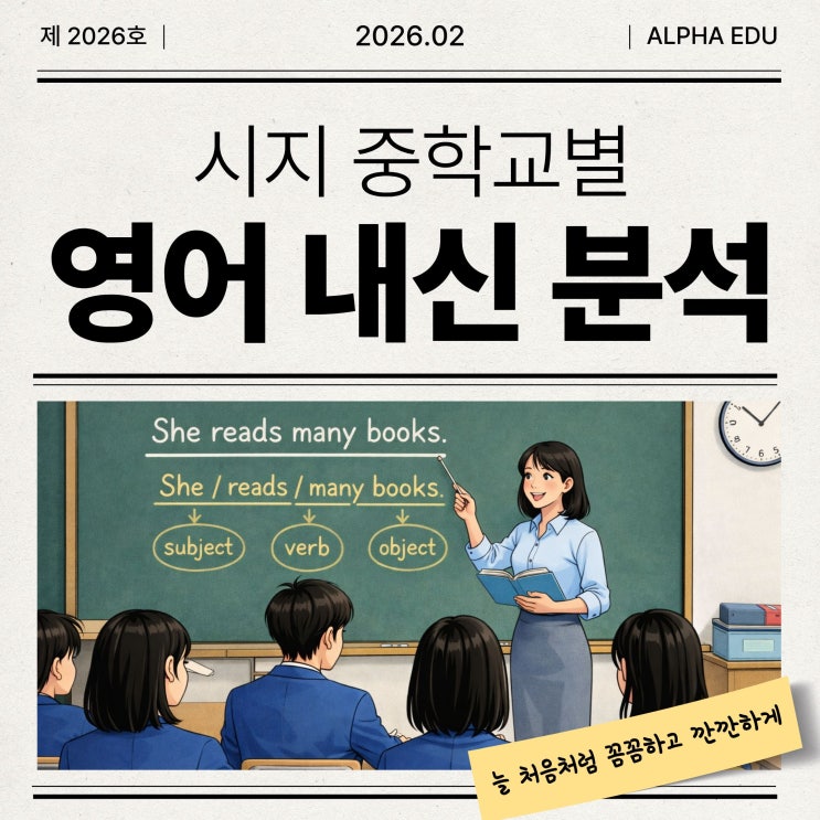[시지 영어학원] 시지 중학교별 영어 내신 분석, 알파영어학원 안녕하세요. 시지 영어전문학원 알파영어학원입니다. 중학교 영어는 초등 영어와 완전히 다른 영역입니다. 단어를 얼마나 많이 외웠는지가 아니라, 얼마나 정확하게 이해하고 적용할 수 있는지가 점수로 드러나는 시기이기 때문입니다. 특히 시지 지역 중학교들은 최근 몇 년 사이 영어 시험 출제 방식의 변화가 뚜렷하게 나타나고 있으며, 학교별 시험 성향 차이도 점점 커지고 있습니다. 이번 글에서는 시지알파영어학원이 실제 시험을 분석한 내용을 바탕으로, 시지 중학교별 영어 시험 특징과 그에 맞는 학습 전략을 학부모님 눈높이에서 정리해드립니다. 시지 중학교별 영어 시....... <img src="https://blogthumb.pstatic.net/MjAyNjAyMDNfNjYg/MDAxNzcwMTAwNTU4NTk4.LdHJL8W0kVvKyMlvJxPbLmF8_dXcHJwBhRx6PsDx7oUg.PbsUrBRJciHu1OM5Bz8rI7qp_1APPkJ4OfswJ1FSYv4g.JPEG/1.jpg?type=s3" />