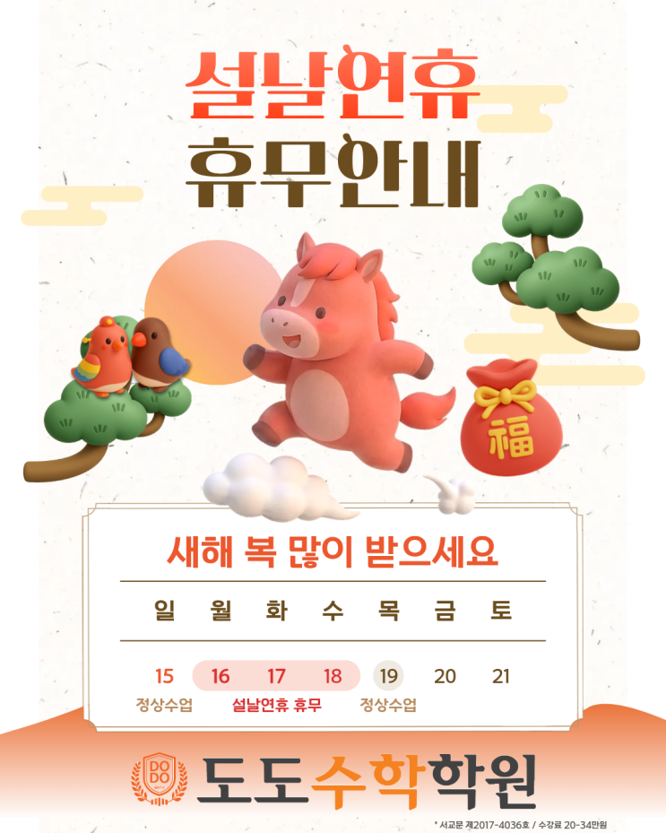 안녕하세요. 도도수학입니다. 다가오는 설 명절을 맞아 학원 휴원 일정을 안내드립니다. 설 연휴 휴원 일정 2월 16일(월) ~ 2월 18일(수) 위 기간 동안은 수업이 진행되지 않으며, 문의에 대한 답변은 다소 지연될 수 있는 점 양해 부탁드립니다. 정규 수업은 연휴 이후 2월 19일(목)부터 정상적으로 재개됩니다. 따뜻한 설 명절 보내세요 설은 가족과 함께 한 해의 안부를 나누고 새로운 다짐을 하는 소중한 시간입니다. 2026년에도 도도수학은 아이들이 수학 앞에서 자신감을 잃지 않도록, 기본을 단단히 다질 수 있도록 차분하고 꾸준하게 지도하겠습니다. 짧은 연휴 동안 아이들도 충분히 쉬며 재충전하고, 가족과 따뜻한 시간 보내....... <img src="https://blogthumb.pstatic.net/MjAyNjAyMTBfMjY1/MDAxNzcwNzAwOTI3NTI5.XezVsMwob5fO3I1zIWJrxcQmcRNVIOIMSISaH4di6zEg.F4R0BPaG_tDwzTGqmuiHaqpyybU-GD9fDhEp2gH4ghAg.PNG/%C1%A6%B8%F1%C0%BB_%C0%D4%B7%C2%C7%D8%C1%D6%BC%BC%BF%E4._%281%29.png?type=s3" />